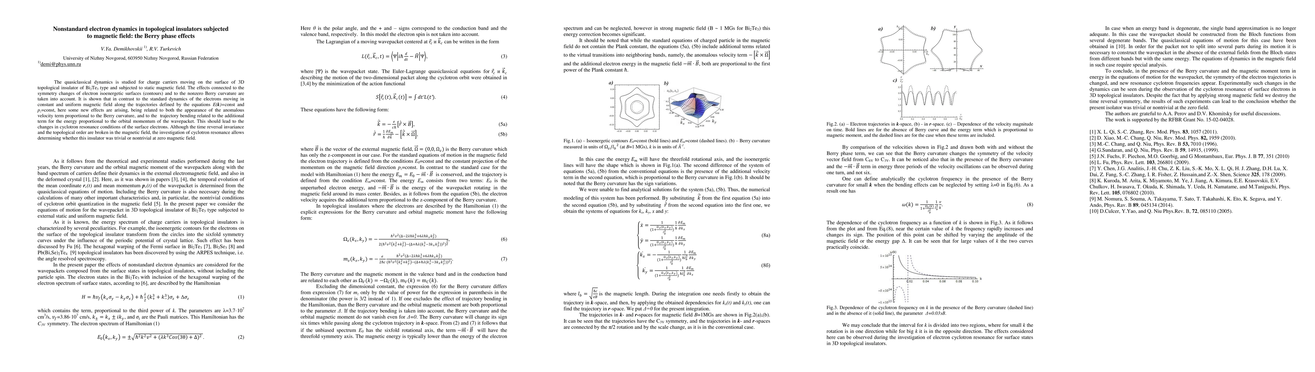 This research explores electron behavior on Bi2Te3 topological insulator surfaces under magnetic fields, revealing anomalous velocity and trajectory bending due to Berry curvature. Despite broken time reversal invariance and topological order, cyclotron resonance analysis can determine if the insulator is trivial or nontrivial at zero field.