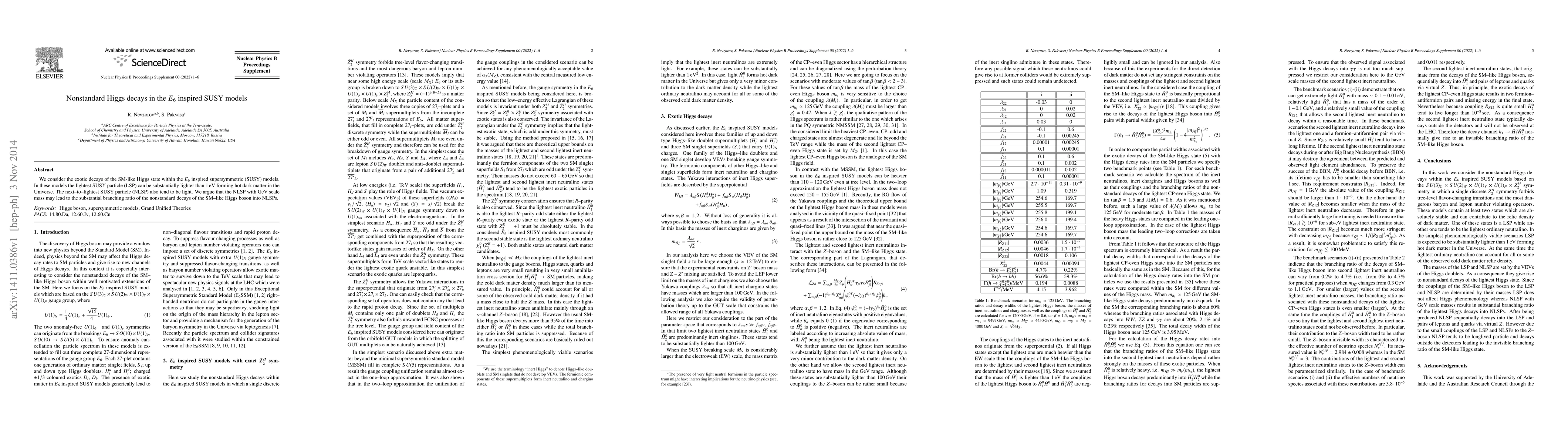 We consider the exotic decays of the SM-like Higgs state within the E6 inspired supersymmetric (SUSY) models. In these models the lightest SUSY particle (LSP) can be substantially lighter than 1 eV forming hot dark matter in the Universe. The next--to--lightest SUSY particle (NLSP) also tend to be light. We argue that the NLSP with GeV scale mass may lead to the substantial branching ratio of the nonstandard decays of the SM-like Higgs boson into NLSPs.