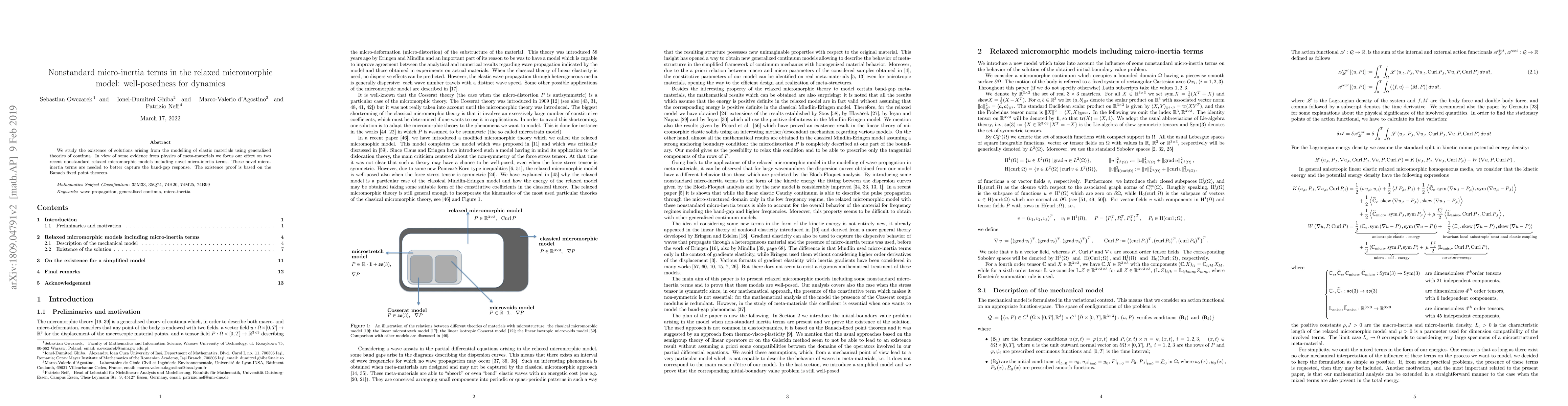 This paper investigates the existence of solutions in elastic material models using generalized continua theories, focusing on novel nonstandard micro-inertia terms in relaxed micromorphic models to better capture the band-gap response. The existence proof is established using the Banach fixed point theorem.