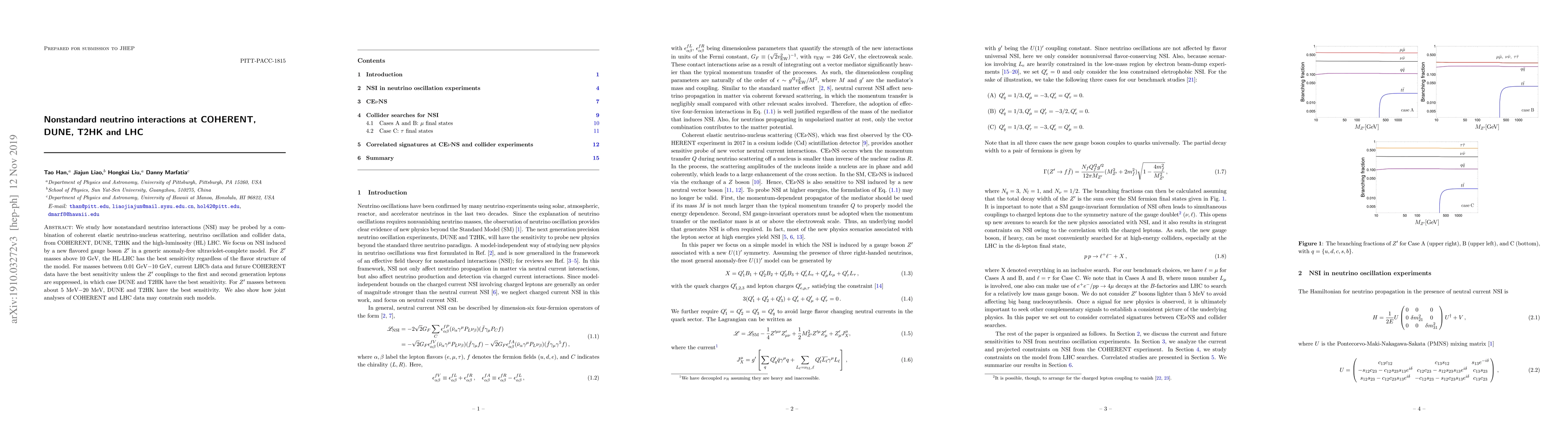 This paper investigates the potential of various experiments to probe nonstandard neutrino interactions (NSI) induced by a new flavored gauge boson $Z'$. It finds that the high-luminosity LHC is most sensitive for $Z'$ masses above 10 GeV, while COHERENT, DUNE, and T2HK are optimal for lower masses, depending on the $Z'$ couplings to different lepton generations.