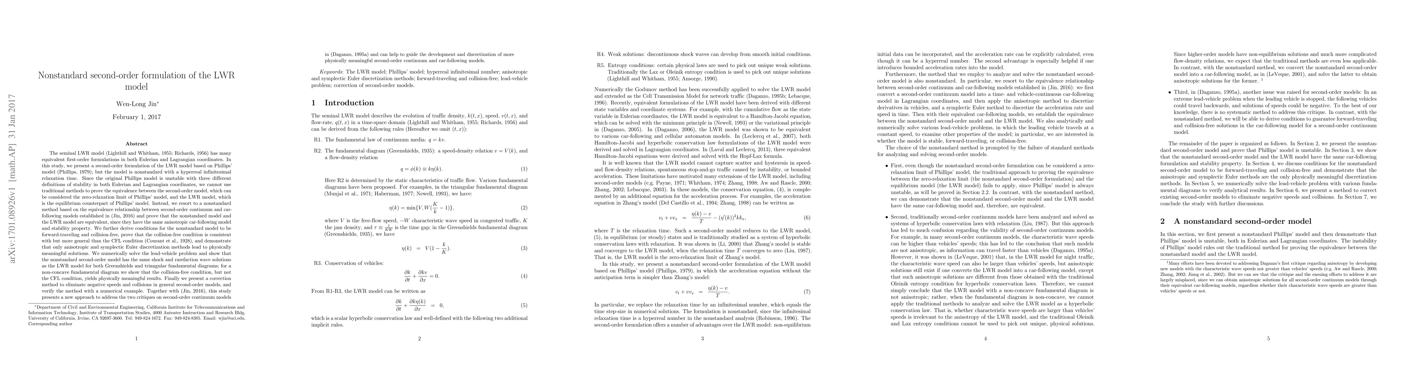 We present a second-order formulation of the LWR model based on Phillips' model (Phillips, 1979); but the model is nonstandard with a hyperreal infinitesimal relaxation time. Since the original Phillips model is unstable with three different definitions of stability in both Eulerian and Lagrangian coordinates, we cannot use traditional methods to prove the equivalence between the second-order model, which can be considered the zero-relaxation limit of Phillips' model, and the LWR model, which is the equilibrium counterpart of Phillips' model. Instead, we resort to a nonstandard method based on the equivalence relationship between second-order continuum and car-following models established in (Jin, 2016) and prove that the nonstandard model and the LWR model are equivalent, since they have the same anisotropic car-following model and stability property. We further derive conditions for the nonstandard model to be forward-traveling and collision-free, prove that the collision-free condition is consistent with but more general than the CFL condition (Courant et al., 1928), and demonstrate that only anisotropic and symplectic Euler discretization methods lead to physically meaningful solutions. We numerically solve the lead-vehicle problem and show that the nonstandard second-order model has the same shock and rarefaction wave solutions as the LWR model for both Greenshields and triangular fundamental diagrams; for a non-concave fundamental diagram we show that the collision-free condition, but not the CFL condition, yields physically meaningful results. Finally we present a correction method to eliminate negative speeds and collisions in general second-order models, and verify the method with a numerical example.