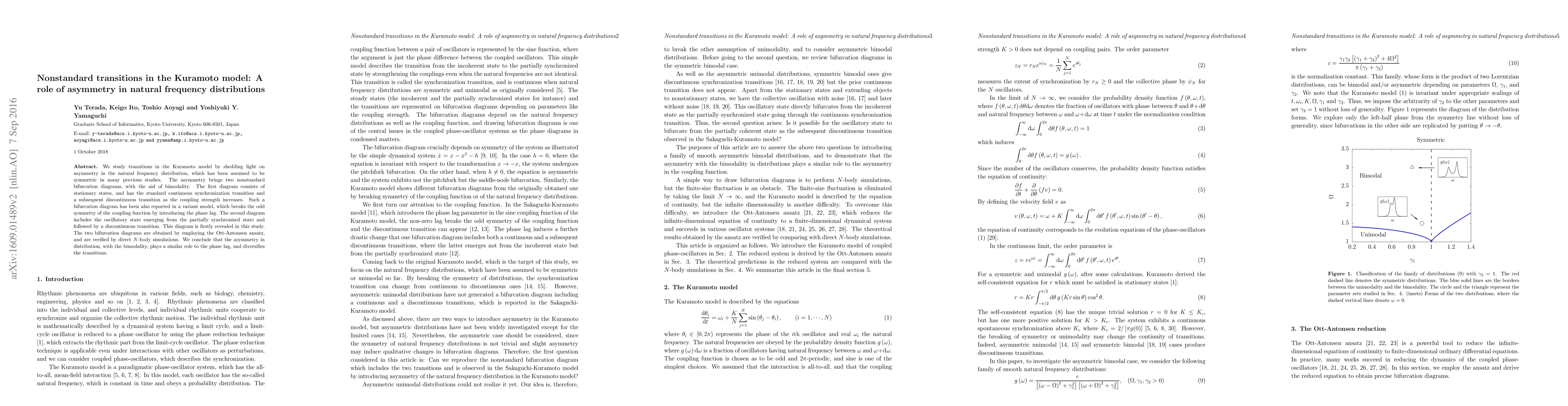 This paper investigates transitions in the Kuramoto model, revealing the impact of asymmetry in natural frequency distribution, which typically assumes symmetry. It identifies two nonstandard bifurcation diagrams due to bimodality, showing both continuous and discontinuous transitions, and introduces a new diagram featuring oscillatory states.