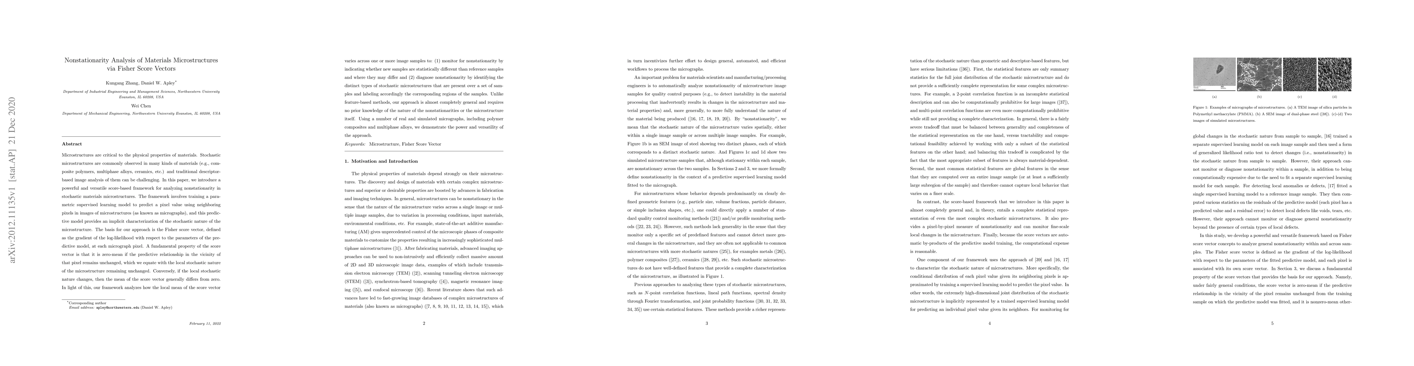 This paper introduces a novel framework for analyzing nonstationarity in stochastic materials microstructures using Fisher score vectors. The approach trains a supervised learning model to predict pixel values in microstructure images, leveraging the Fisher score vector to characterize local stochastic nature changes. The method effectively monitors and diagnoses nonstationarity without requiring prior knowledge of microstructures, demonstrated through real and simulated micrographs.