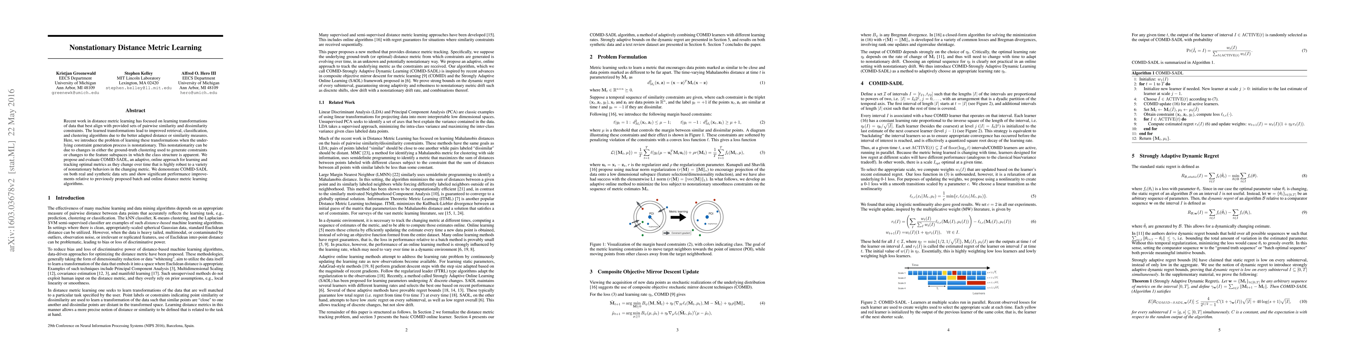 This paper addresses nonstationary distance metric learning, proposing COMID-SADL to adaptively track optimal metrics over time amidst changes in data constraints or feature subspaces. The method demonstrates significant performance improvements over existing batch and online algorithms on both real and synthetic datasets.