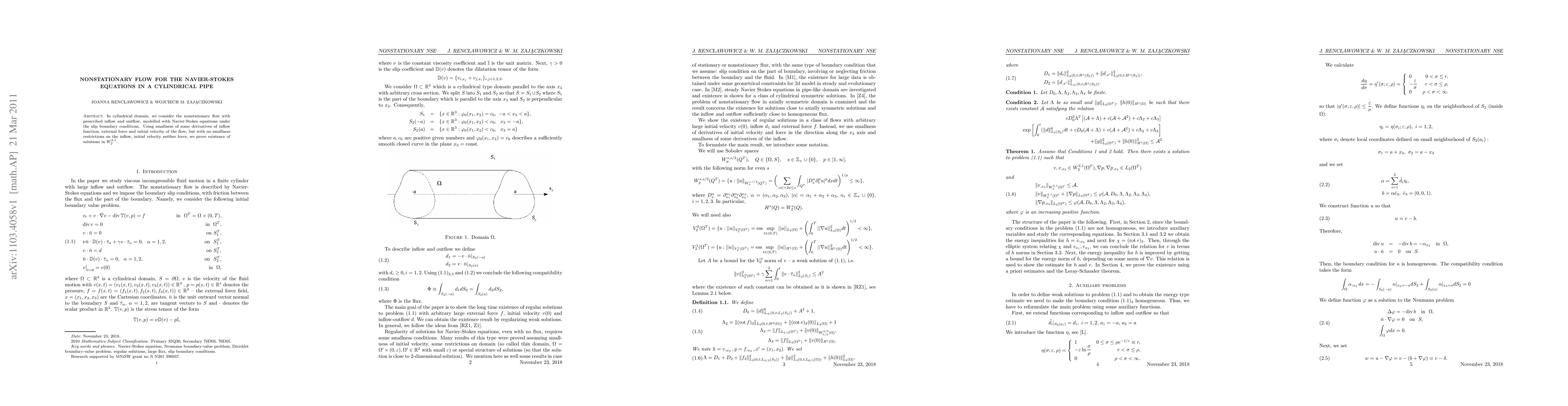 This paper proves the existence of solutions to the nonstationary Navier-Stokes equations in a cylindrical pipe under slip boundary conditions, given smallness conditions on certain derivatives of inflow, external force, and initial velocity, without requiring smallness of the inflow, initial velocity, or force itself. The solutions are shown to exist in the function space $W^{2,1}_2$.