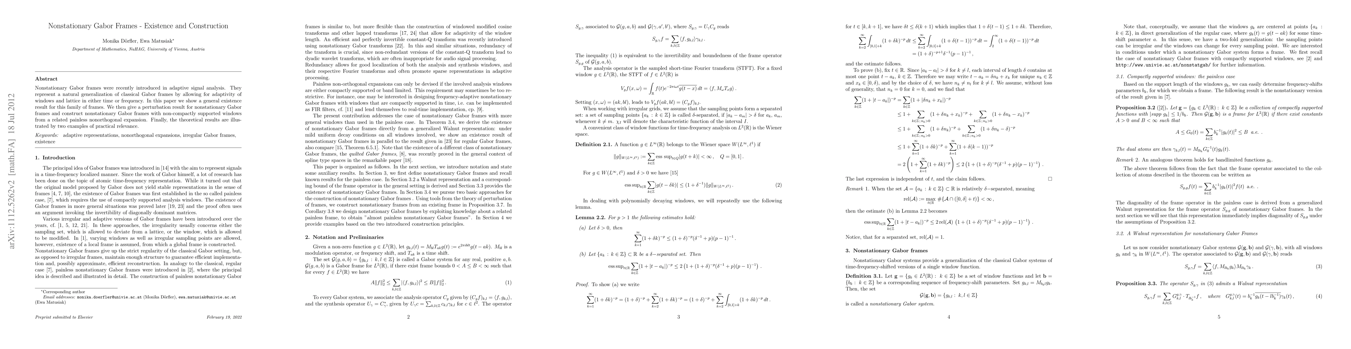 The paper presents a theoretical analysis of nonstationary Gabor frames, focusing on existence and construction, with a perturbation result and examples illustrating practical relevance.