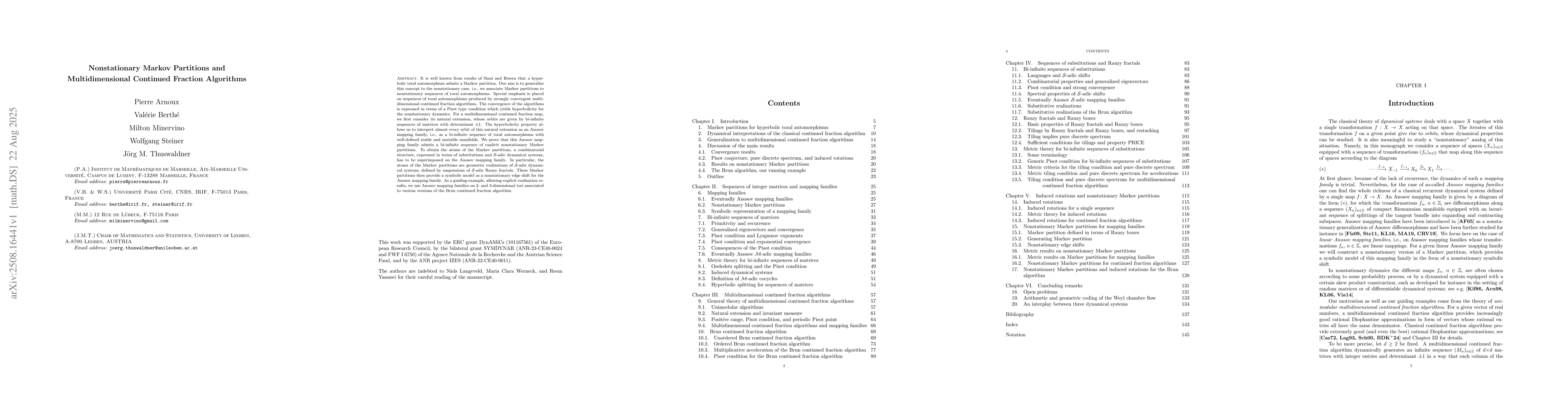 It is well known from results of Sina\u{\i} and Bowen that a hyperbolic toral automorphism admits a Markov partition. Our aim is to generalize this concept to the nonstationary case, i.e., we associate Markov partitions to nonstationary sequences of toral automorphisms. Special emphasis is placed on sequences of toral automorphisms produced by strongly convergent multidimensional continued fraction algorithms. The convergence of the algorithms is expressed in terms of a Pisot type condition which yields hyperbolicity for the nonstationary dynamics. For a multidimensional continued fraction map, we first consider its natural extension, whose orbits are given by bi-infinite sequences of matrices with determinant $\pm 1$. The hyperbolicity property allows us to interpret almost every orbit of this natural extension as an Anosov mapping family, i.e., as a bi-infinite sequence of toral automorphisms with well-defined stable and unstable manifolds. We prove that this Anosov mapping family admits a bi-infinite sequence of explicit nonstationary Markov partitions. To obtain the atoms of the Markov partitions, a combinatorial structure, expressed in terms of substitutions and $\mathcal{S}$-adic dynamical systems, has to be superimposed on the Anosov mapping family. In particular, the atoms of the Markov partitions are geometric realizations of $\mathcal{S}$-adic dynamical systems, defined by suspensions of $\mathcal{S}$-adic Rauzy fractals. These Markov partitions then provide a symbolic model as a nonstationary edge shift for the Anosov mapping family. As a guiding example, allowing explicit realization results, we use Anosov mapping families on 2- and 3-dimensional tori associated to various versions of the Brun continued fraction algorithm.