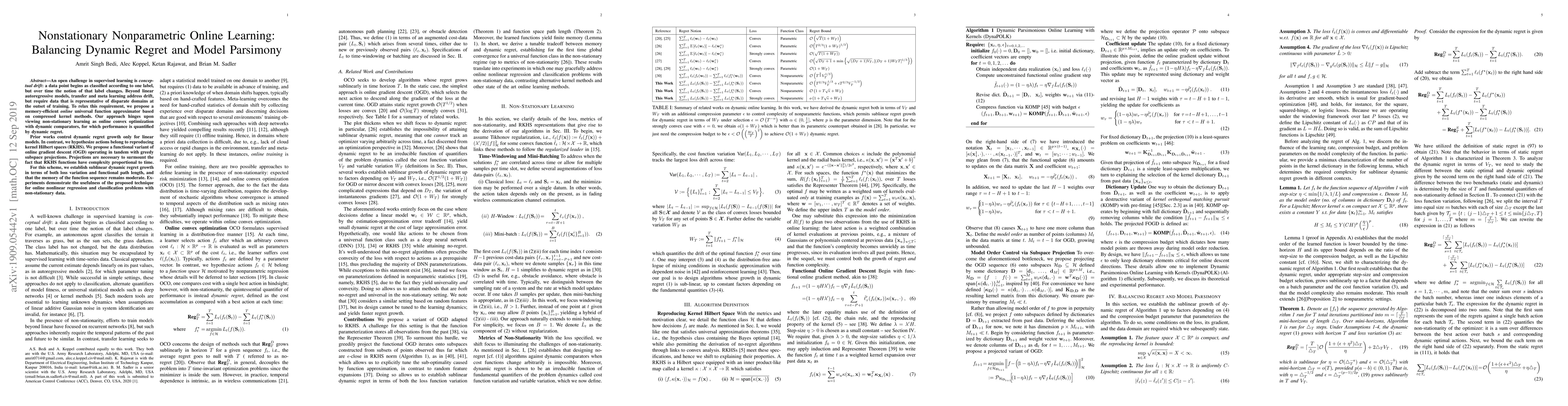 An open challenge in supervised learning is \emph{conceptual drift}: a data point begins as classified according to one label, but over time the notion of that label changes. Beyond linear autoregressive models, transfer and meta learning address drift, but require data that is representative of disparate domains at the outset of training. To relax this requirement, we propose a memory-efficient \emph{online} universal function approximator based on compressed kernel methods. Our approach hinges upon viewing non-stationary learning as online convex optimization with dynamic comparators, for which performance is quantified by dynamic regret. Prior works control dynamic regret growth only for linear models. In contrast, we hypothesize actions belong to reproducing kernel Hilbert spaces (RKHS). We propose a functional variant of online gradient descent (OGD) operating in tandem with greedy subspace projections. Projections are necessary to surmount the fact that RKHS functions have complexity proportional to time. For this scheme, we establish sublinear dynamic regret growth in terms of both loss variation and functional path length, and that the memory of the function sequence remains moderate. Experiments demonstrate the usefulness of the proposed technique for online nonlinear regression and classification problems with non-stationary data.