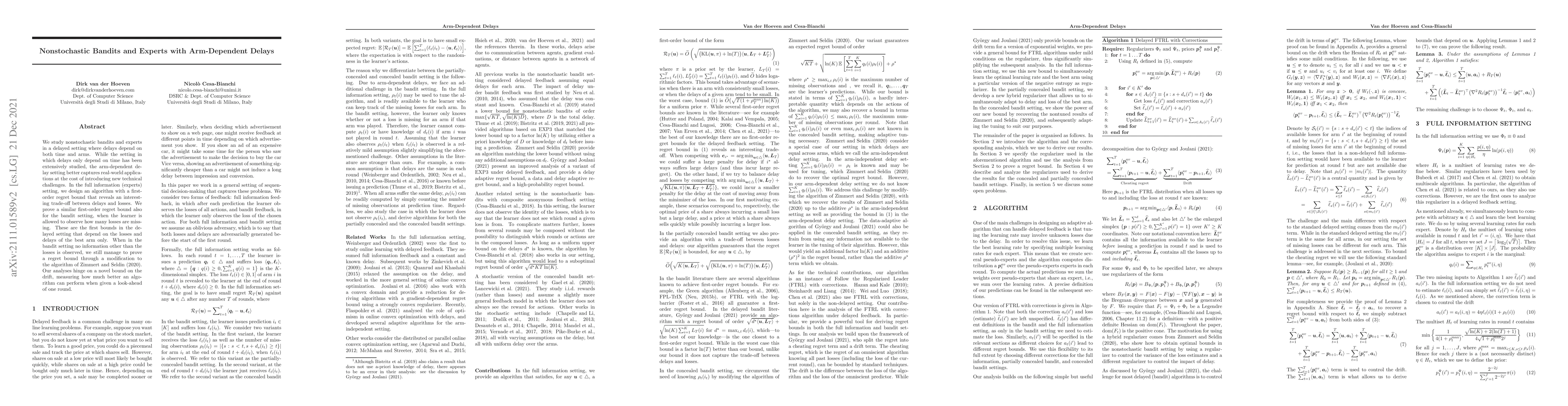 The paper studies nonstochastic bandits and experts with arm-dependent delays, introducing new technical challenges compared to time-dependent delays. It proposes algorithms with first-order regret bounds for both full information (experts) and bandit settings, considering losses and delays of the best arm only.