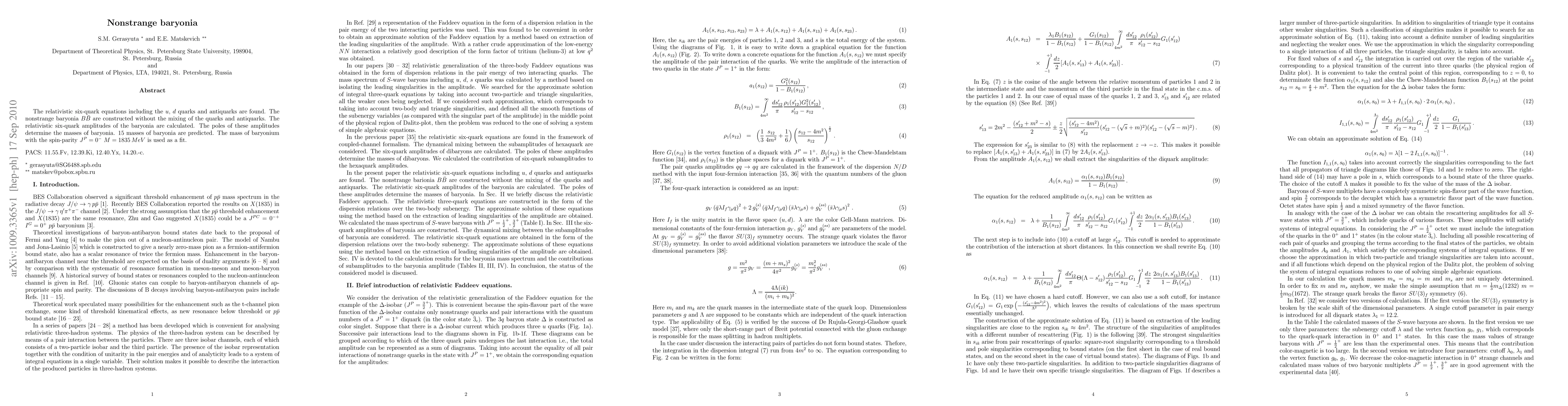 The relativistic six-quark equations including the $u$, $d$ quarks and antiquarks are found. The nonstrange baryonia $B \bar B$ are constructed without the mixing of the quarks and antiquarks. The relativistic six-quark amplitudes of the baryonia are calculated. The poles of these amplitudes determine the masses of baryonia. 15 masses of baryonia are predicted. The mass of baryonium with the spin-parity $J^P=0^-$ $M=1835\, MeV$ is used as a fit.