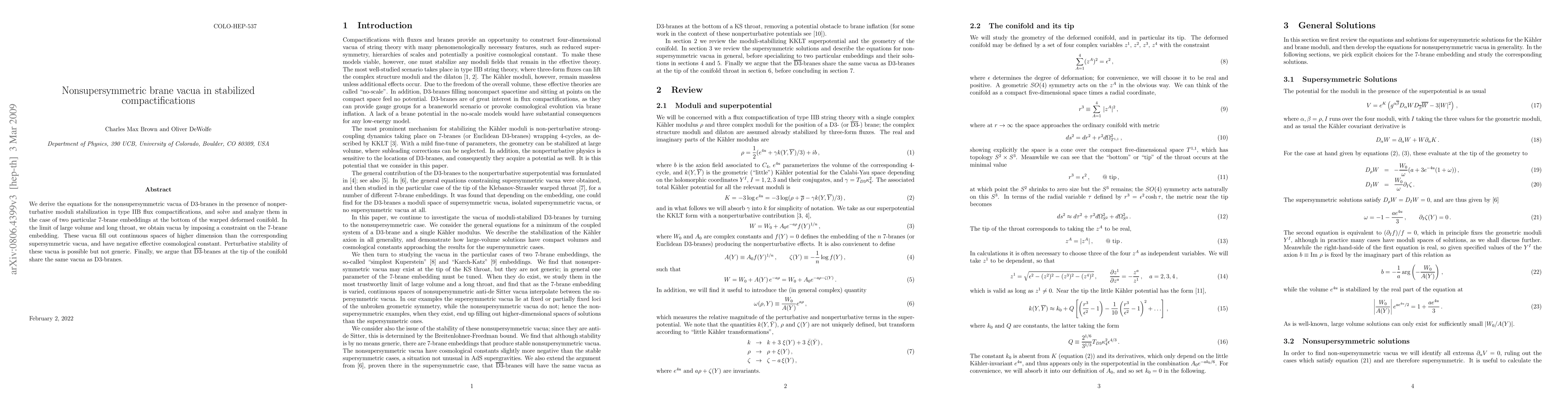 This paper derives equations for nonsupersymmetric vacua of D3-branes in stabilized type IIB flux compactifications, focusing on two specific 7-brane embeddings. It finds these vacua have a negative cosmological constant and occupy higher-dimensional spaces than supersymmetric vacua, though perturbative stability is not universal.
