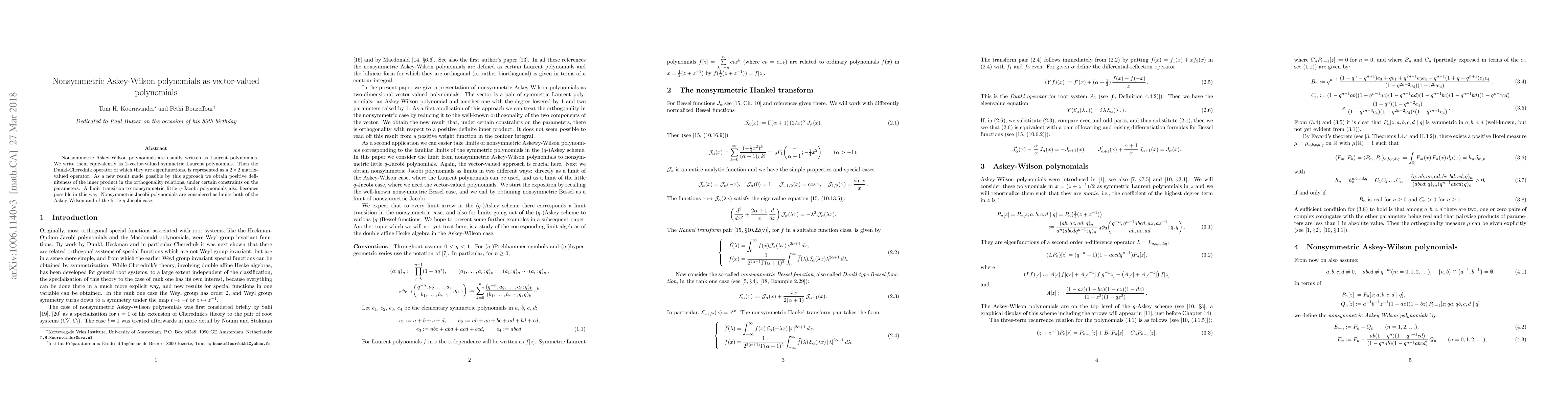 Nonsymmetric Askey-Wilson polynomials are usually written as Laurent polynomials. We write them equivalently as 2-vector-valued symmetric Laurent polynomials. Then the Dunkl-Cherednik operator of which they are eigenfunctions, is represented as a 2x2 matrix-valued operator. As a new result made possible by this approach we obtain positive definiteness of the inner product in the orthogonality relations, under certain constraints on the parameters. A limit transition to nonsymmetric little q-Jacobi polynomials also becomes possible in this way. Nonsymmetric Jacobi polynomials are considered as limits both of the Askey-Wilson and of the little q-Jacobi case.
