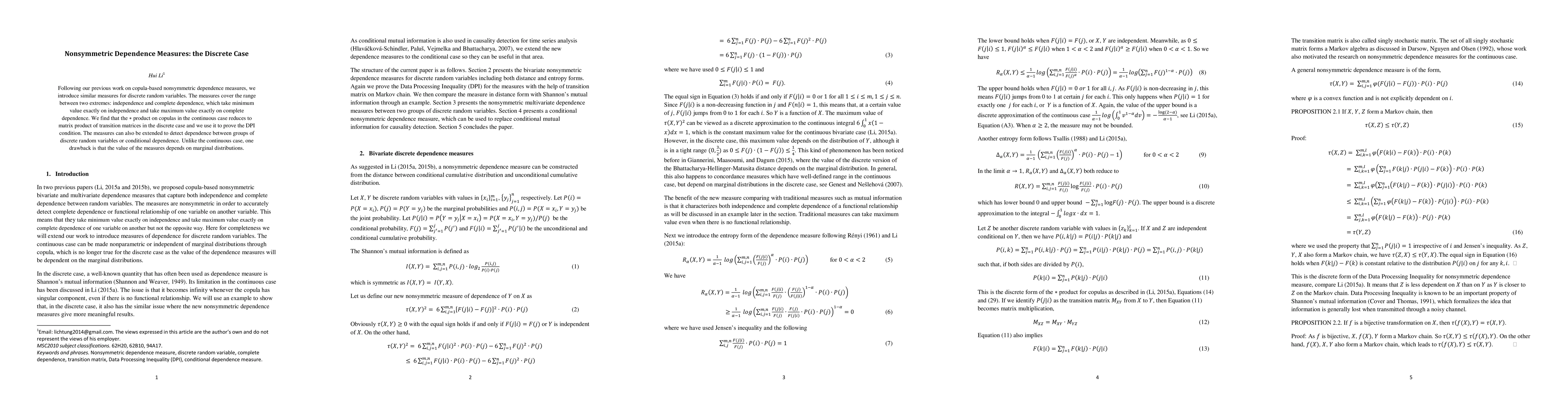 This paper introduces nonsymmetric dependence measures for discrete random variables, extending previous work on continuous cases. The measures capture the range between independence and complete dependence, utilizing the matrix product of transition matrices to prove the DPI condition, and can detect dependence between groups or conditional dependence. However, unlike continuous measures, these values depend on the marginal distributions.