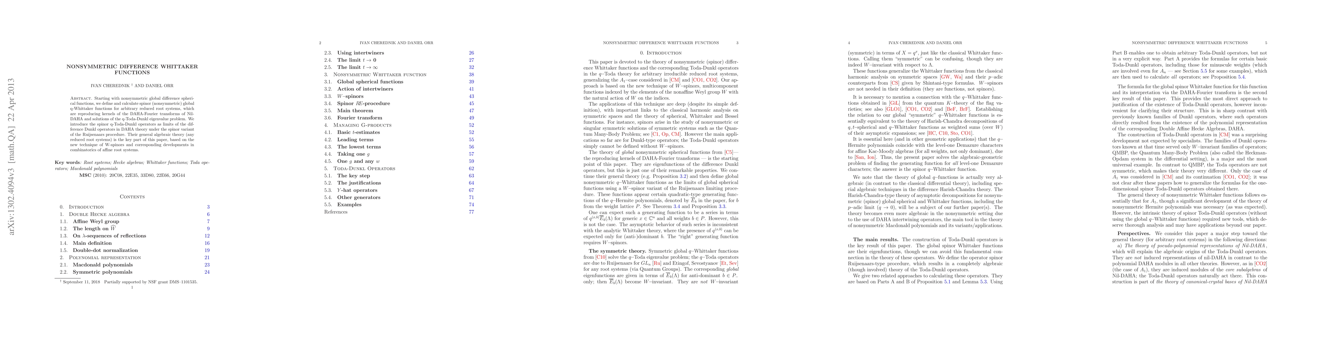 This paper introduces nonsymmetric global difference spherical functions and defines spinor (nonsymmetric) global q-Whittaker functions for arbitrary reduced root systems, acting as reproducing kernels in DAHA-Fourier transforms and solutions to the q-Toda-Dunkl eigenvalue problem. It also presents the spinor q-Toda-Dunkl operators as limits of difference Dunkl operators, grounded in an algebraic theory based on W-spinors and combinatorial developments of affine root systems.