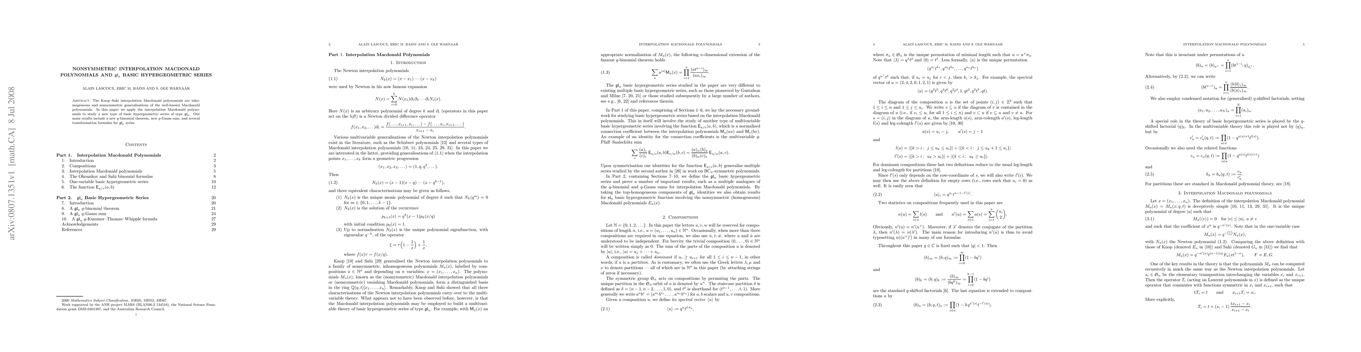This paper studies nonsymmetric interpolation Macdonald polynomials to investigate a new class of g_n basic hypergeometric series, leading to a novel q-binomial theorem, a new q-Gauss sum, and transformation formulas for the g_n series.