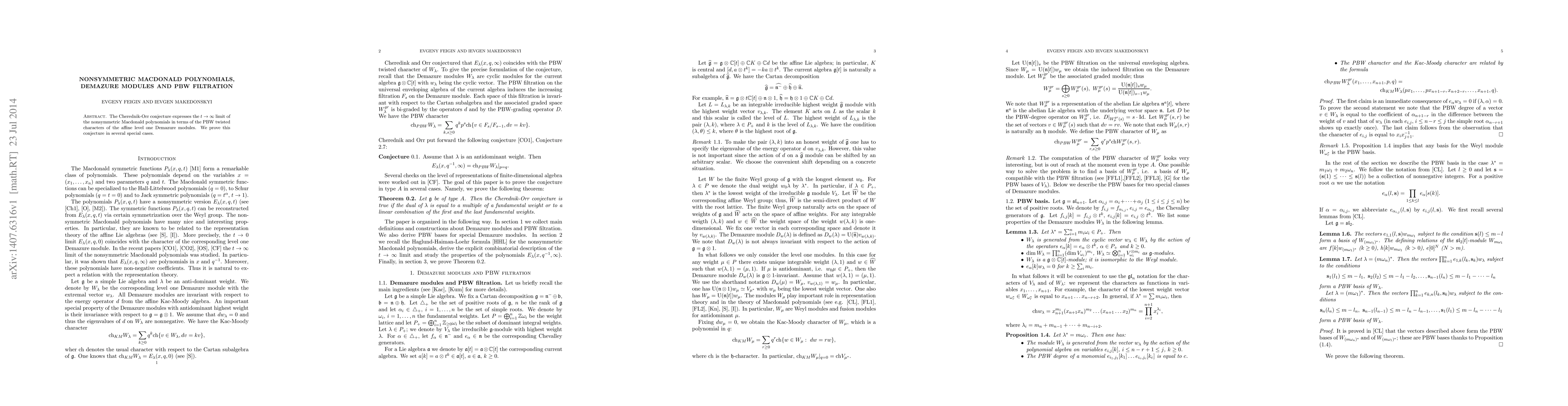 Summary: The Cherednik-Orr conjecture linking the $t\to\infty$ limit of nonsymmetric Macdonald polynomials to affine Demazure modules is proven in specific instances, establishing a connection between these mathematical objects.