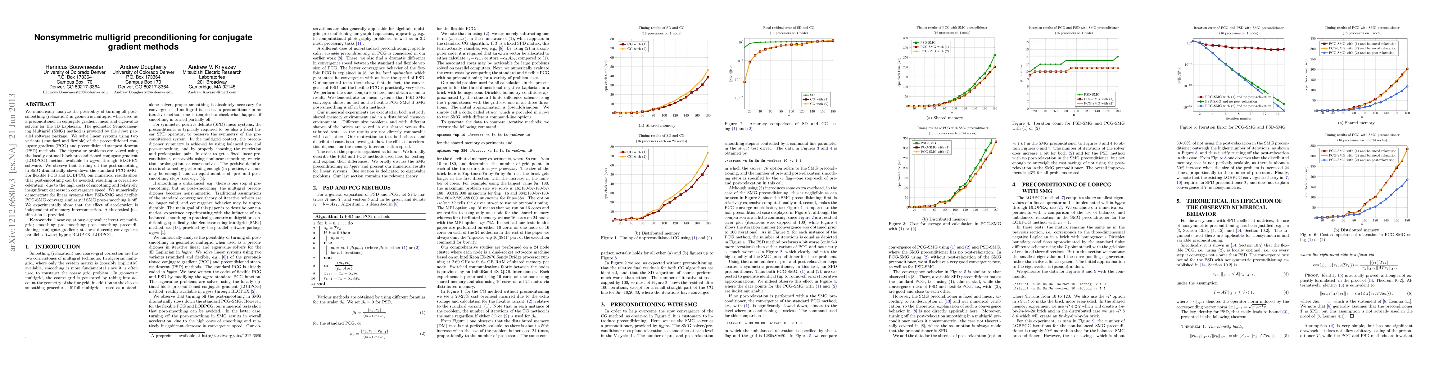 We numerically analyze the possibility of turning off post-smoothing (relaxation) in geometric multigrid when used as a preconditioner in conjugate gradient linear and eigenvalue solvers for the 3D Laplacian. The geometric Semicoarsening Multigrid (SMG) method is provided by the hypre parallel software package. We solve linear systems using two variants (standard and flexible) of the preconditioned conjugate gradient (PCG) and preconditioned steepest descent (PSD) methods. The eigenvalue problems are solved using the locally optimal block preconditioned conjugate gradient (LOBPCG) method available in hypre through BLOPEX software. We observe that turning off the post-smoothing in SMG dramatically slows down the standard PCG-SMG. For flexible PCG and LOBPCG, our numerical results show that post-smoothing can be avoided, resulting in overall acceleration, due to the high costs of smoothing and relatively insignificant decrease in convergence speed. We numerically demonstrate for linear systems that PSD-SMG and flexible PCG-SMG converge similarly if SMG post-smoothing is off. We experimentally show that the effect of acceleration is independent of memory interconnection. A theoretical justification is provided.