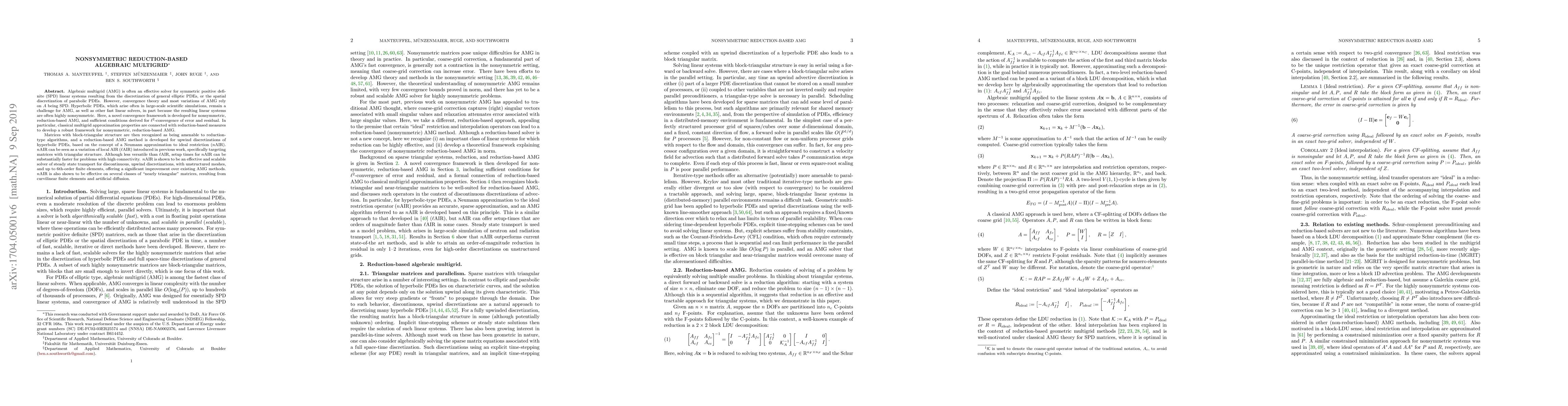 This paper introduces a novel convergence framework for nonsymmetric, reduction-based algebraic multigrid (AMG) methods, specifically targeting hyperbolic PDEs. The proposed Neumann approximation to ideal restriction (nAIR) method offers a scalable and effective solver for steady-state transport problems with unstructured meshes and high-order finite elements, significantly improving upon existing AMG approaches.