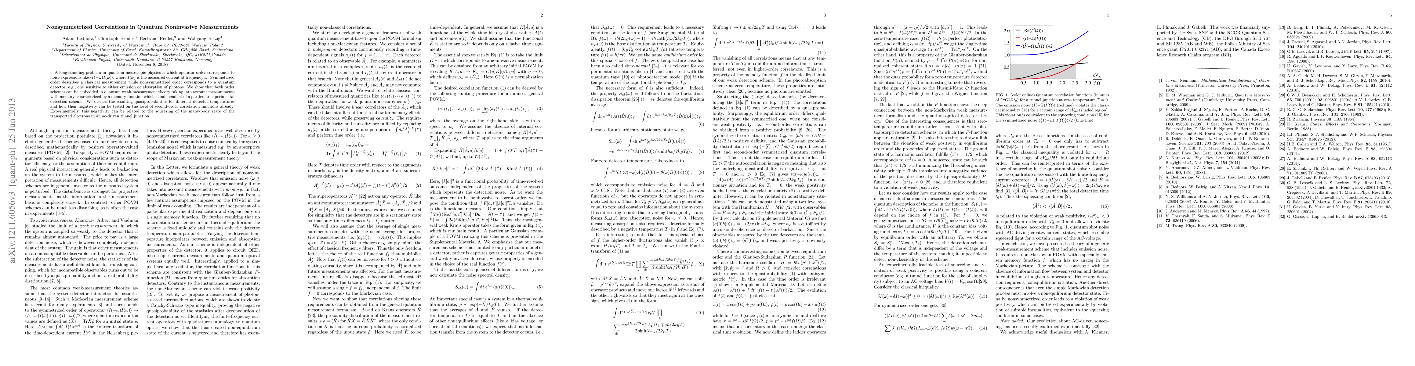 A long-standing problem in quantum mesoscopic physics is which operator order corresponds to noise expressions like , where I(\omega) is the measured current at frequency \omega. Symmetrized order describes a classical measurement while nonsymmetrized order corresponds to a quantum detector, e.g., one sensitive to either emission or absorption of photons. We show that both order schemes can be embedded in quantum weak-measurement theory taking into account measurements with memory, characterized by a memory function which is independent of a particular experimental detection scheme. We discuss the resulting quasiprobabilities for different detector temperatures and how their negativity can be tested on the level of second-order correlation functions already. Experimentally, this negativity can be related to the squeezing of the many-body state of the transported electrons in an ac-driven tunnel junction.