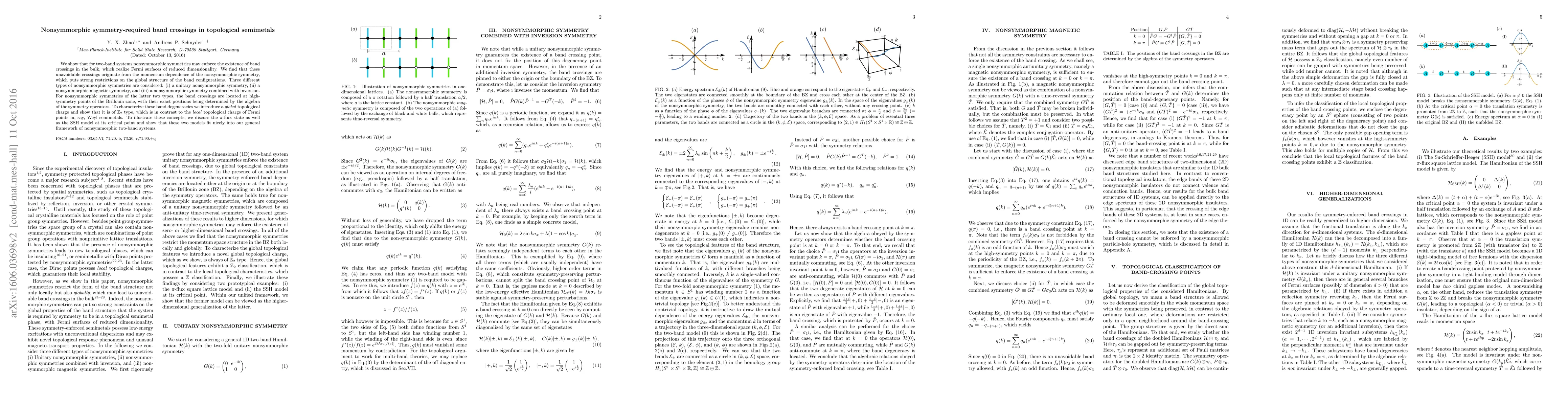 This paper demonstrates that nonsymmorphic symmetries in two-band systems necessitate specific band crossings in topological semimetals, leading to reduced dimensionality Fermi surfaces. It introduces a global $\mathbb{Z}_2$ topological charge to characterize these crossings, contrasting with the local charge of Fermi points in Weyl semimetals.