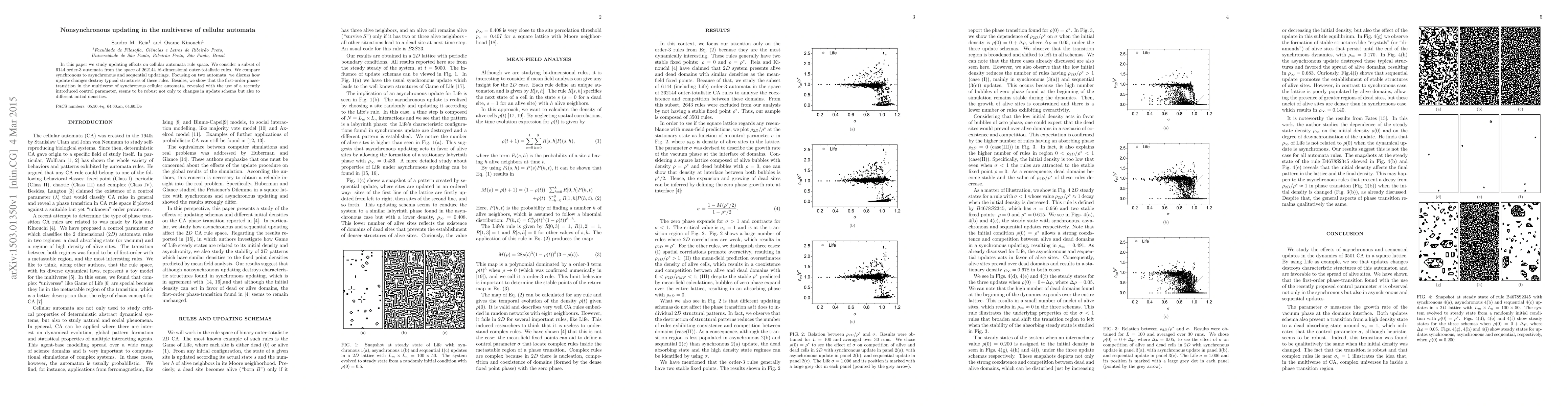 The study examines the effects of nonsynchronous updating (asynchronous and sequential) on a subset of 6144 order-3 cellular automata from the space of 262144 bi-dimensional outer-totalistic rules. It compares synchronous to nonsynchronous updates and investigates how update changes affect typical structures in these rules.