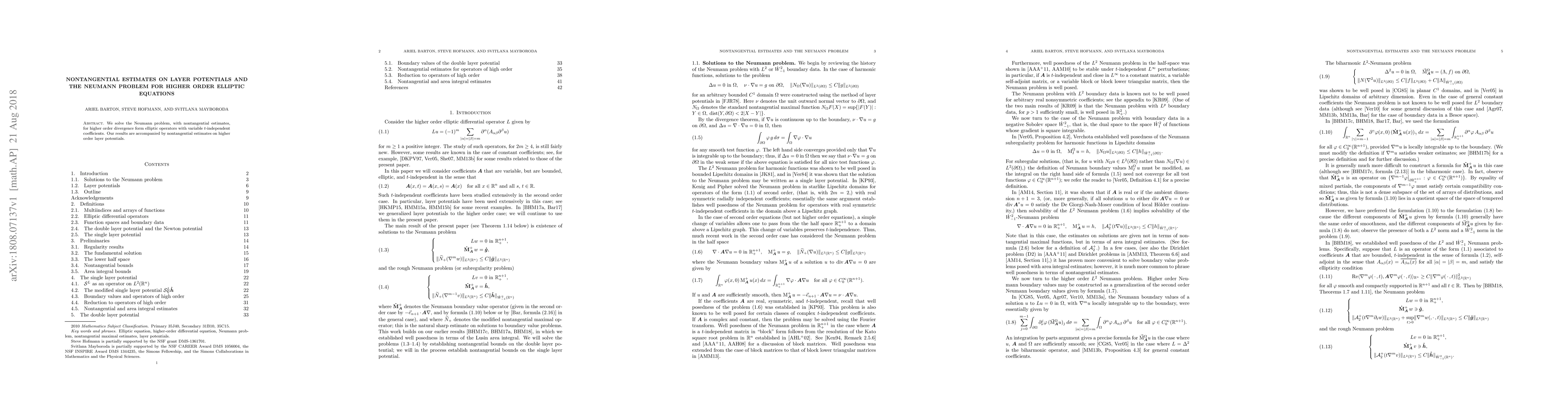 Summary: This paper addresses the Neumann problem for higher order elliptic equations using nontangential estimates, providing solutions and accompanying estimates on higher order layer potentials for divergence form operators with variable coefficients.