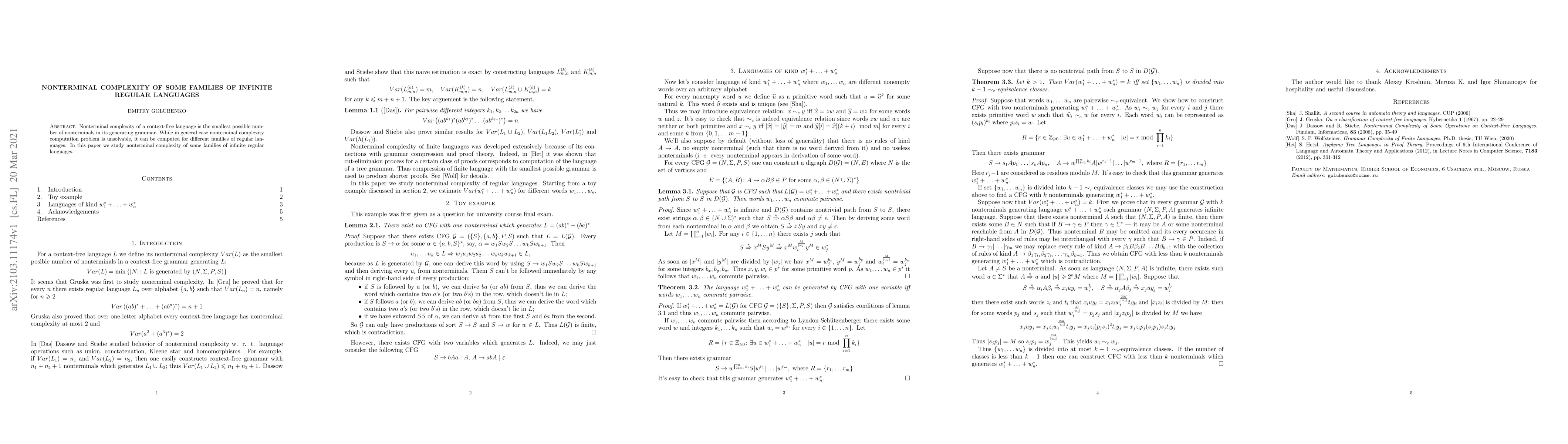 Nonterminal complexity of a context-free language is the smallest possible number of nonterminals in its generating grammar. While in general case nonterminal complexity computation problem is unsolvable, it can be computed for different families of regular languages. In this paper we study nonterminal complexity of some families of infinite regular languages.