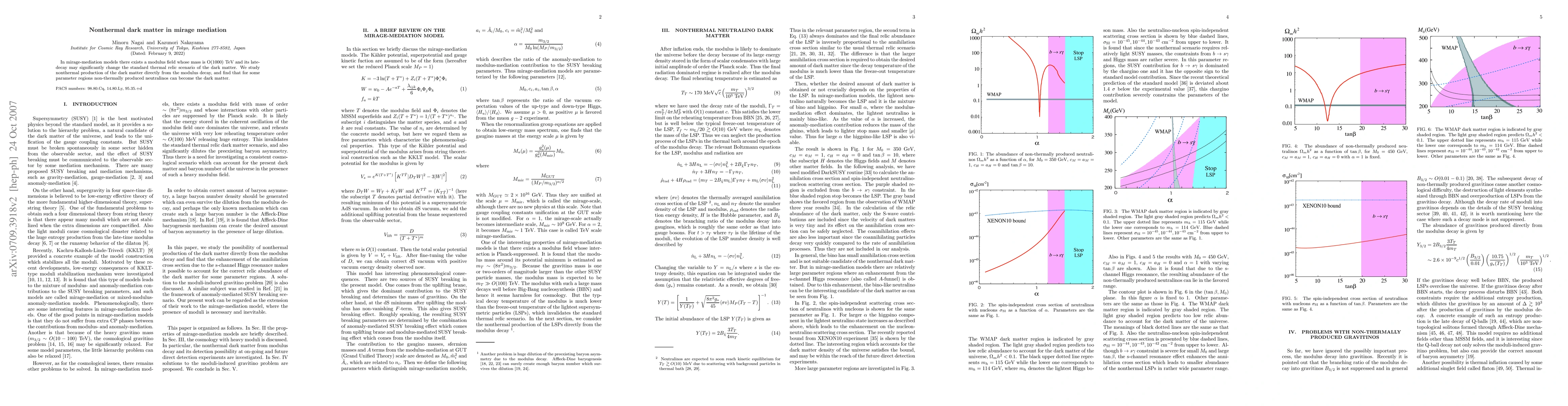 This paper explores mirage mediation models where a modulus field with a mass around 1000 TeV can decay late in the universe, leading to nonthermal dark matter production. The study finds that neutralinos produced nonthermally from the modulus decay can potentially constitute the dark matter in certain parameter regions.