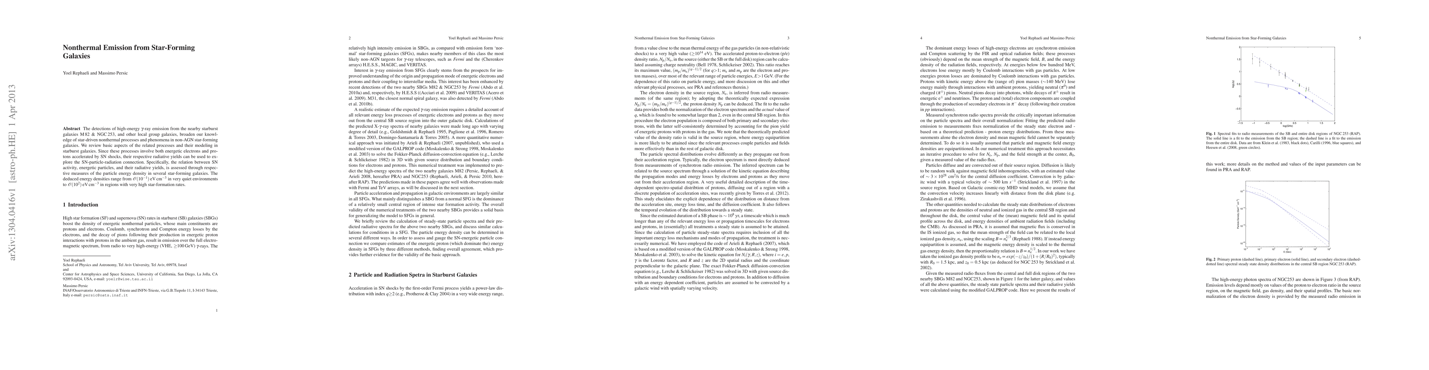The detections of high-energy gamma-ray emission from the nearby starburst galaxies M82 & NGC253, and other local group galaxies, broaden our knowledge of star-driven nonthermal processes and phenomena in non-AGN star-forming galaxies. We review basic aspects of the related processes and their modeling in starburst galaxies. Since these processes involve both energetic electrons and protons accelerated by SN shocks, their respective radiative yields can be used to explore the SN-particle-radiation connection. Specifically, the relation between SN activity, energetic particles, and their radiative yields, is assessed through respective measures of the particle energy density in several star-forming galaxies. The deduced energy densities range from O(0.1) eV/cm^3 in very quiet environments to O(100) eV/cm^3 in regions with very high star-formation rates.