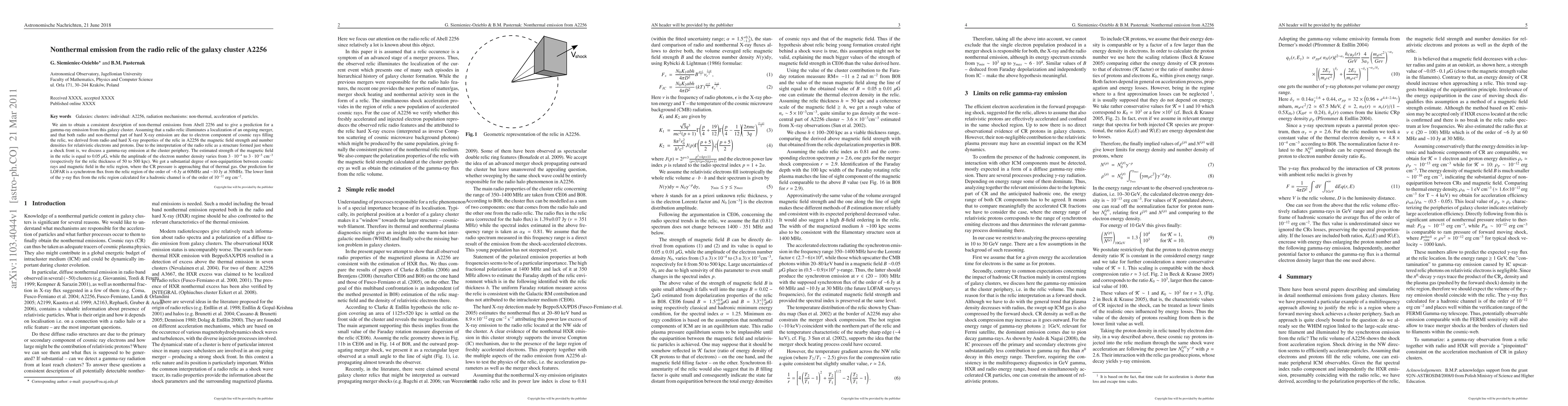 We aim to obtain a consistent description of non-thermal emissions from Abell 2256 and to give a prediction for a gamma-ray emission from this galaxy cluster. Assuming that a radio relic illuminates a localization of an ongoing merger, and that both radio and non-thermal part of hard X-ray emission are due to electron component of cosmic rays filling the relic, we derived from radio and hard X-ray properties of the relic in A2256 the magnetic field strength and number densities for relativistic electrons and protons. Due to the interpretation of the radio relic as a structure formed just where a shock front is, we discuss a gamma-ray emission at the cluster periphery. The estimated strength of the magnetic field in the relic is equal to 0.05 \muG, while the amplitude of the electron number density varies from 3 x 10^{-4} to 3 x 10^{-5} cm^{-3} (respectively for the relic thickness of 50 to 500 kpc). We got a substantial degree of non-equipartition between cosmic rays and magnetic field in the relic region, where the CR pressure is approaching that of thermal gas. Our prediction for LOFAR is a synchrotron flux from the relic region of the order of \sim 6 Jy at 60MHz and \sim 10 Jy at 30MHz. The lower limit of the gamma-ray flux from the relic region calculated for a hadronic channel is of the order of 10^{-12} erg cm^{-2}.