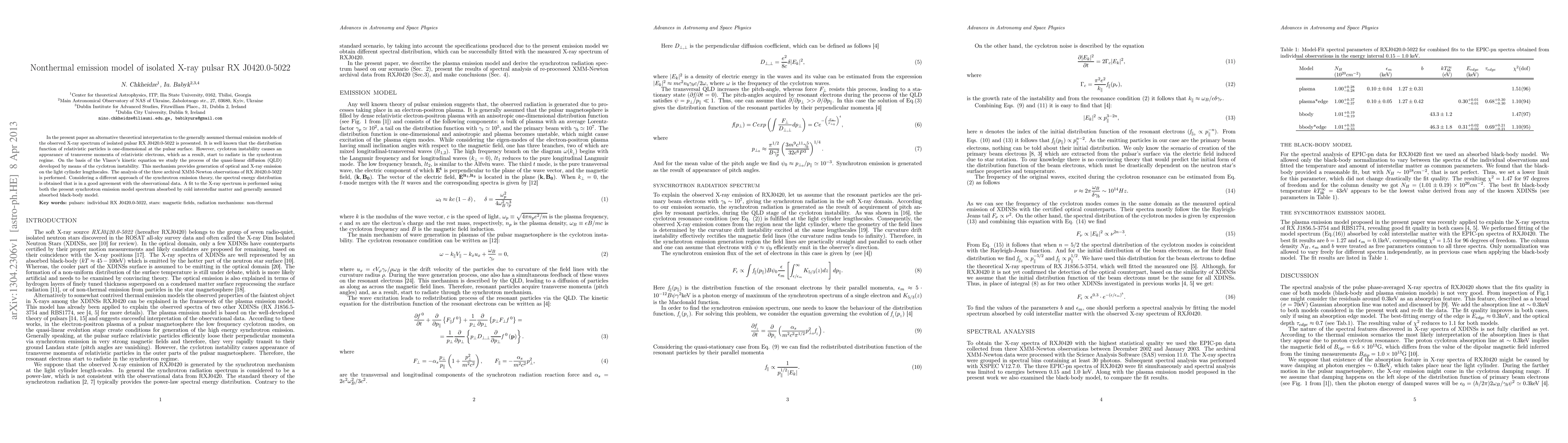In the present paper an alternative theoretical interpretation to the generally assumed thermal emission models of the observed X-ray spectrum of isolated pulsar RX J0420.0-5022 is presented. It is well known that the distribution function of relativistic particles is one-dimensional at the pulsar surface. However, cyclotron instability causes an appearance of transverse momenta of relativistic electrons, which as a result, start to radiate in the synchrotron regime. On the basis of the Vlasov's kinetic equation we study the process of the quasi-linear diffusion (QLD) developed by means of the cyclotron instability. This mechanism provides generation of optical and X-ray emission on the light cylinder lengthscales. The analysis of the three archival XMM-Newton observations of RX J0420.0-5022 is performed. Considering a different approach of the synchrotron emission theory, the spectral energy distribution is obtained that is in a good agreement with the observational data. A fit to the X-ray spectrum is performed using both the present synchrotron emission model spectrum absorbed by cold interstellar matter and generally assumed absorbed black-body model.