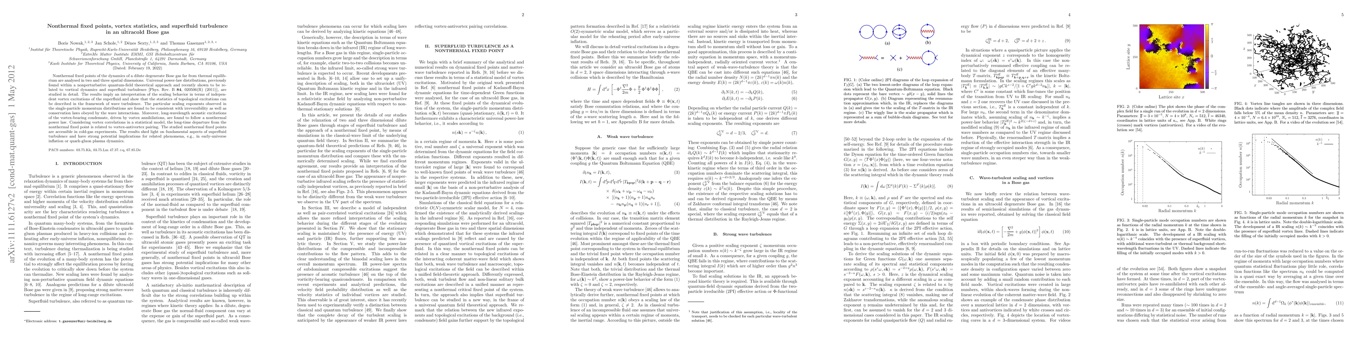 This paper analyzes nonthermal fixed points in ultracold Bose gases, revealing universal power-law distributions linked to vortex dynamics and superfluid turbulence. The study interprets scaling behavior through independent vortex excitations and demonstrates wave turbulence framework applicability.