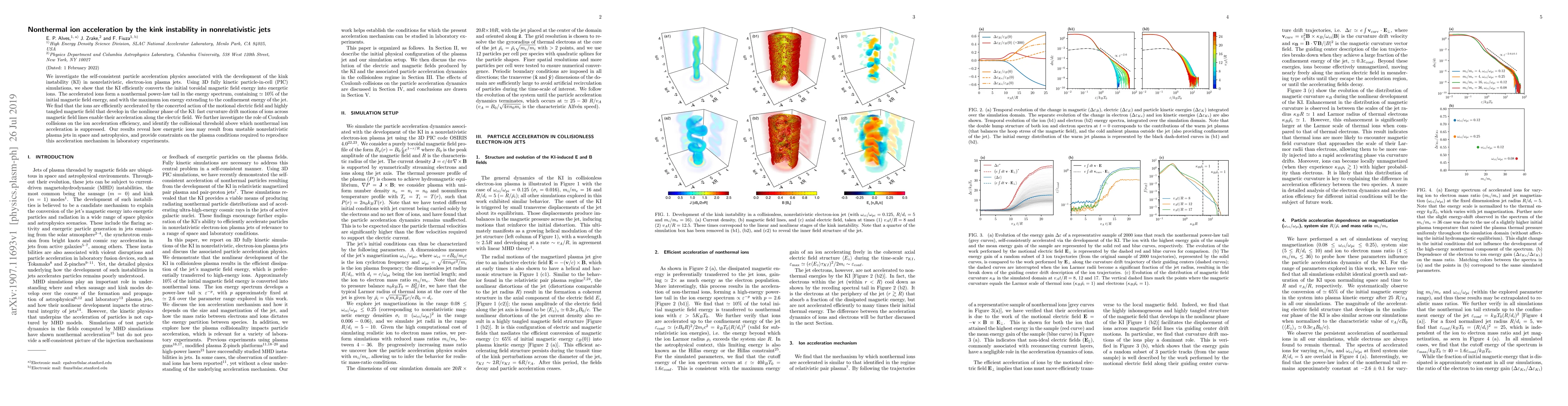 This paper uses 3D kinetic simulations to demonstrate that the kink instability in nonrelativistic jets converts toroidal magnetic field energy into a nonthermal power-law tail of energetic ions, revealing the mechanisms behind their acceleration and the conditions under which this occurs. The study identifies the role of motional electric fields and magnetic field tangles, and the threshold for Coulomb collisions that suppress nonthermal acceleration.