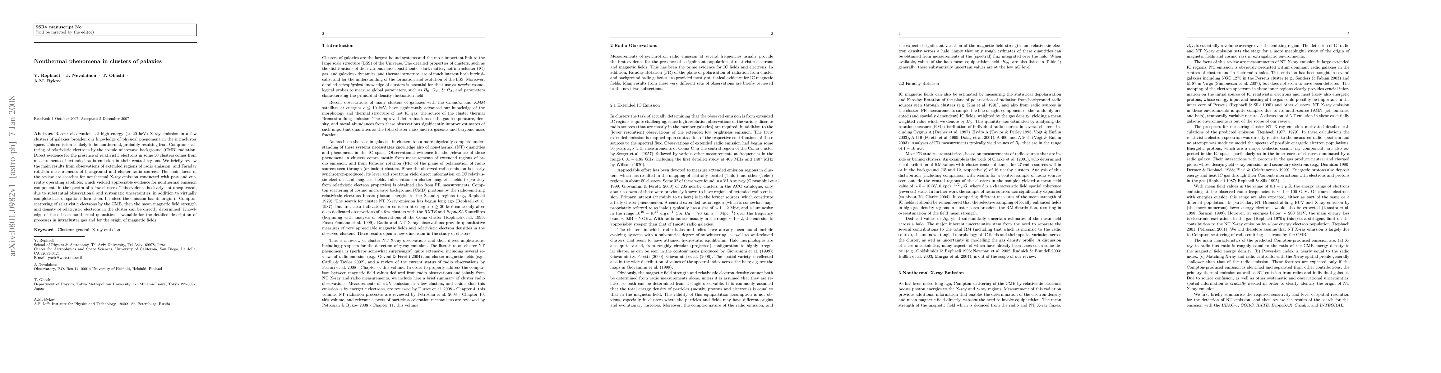 This paper reviews observations of nonthermal X-ray and radio emissions in galaxy clusters, suggesting they originate from relativistic electrons scattering cosmic microwave background radiation. While evidence for nonthermal emission is promising, it remains uncertain due to observational limitations and lack of spatial data.