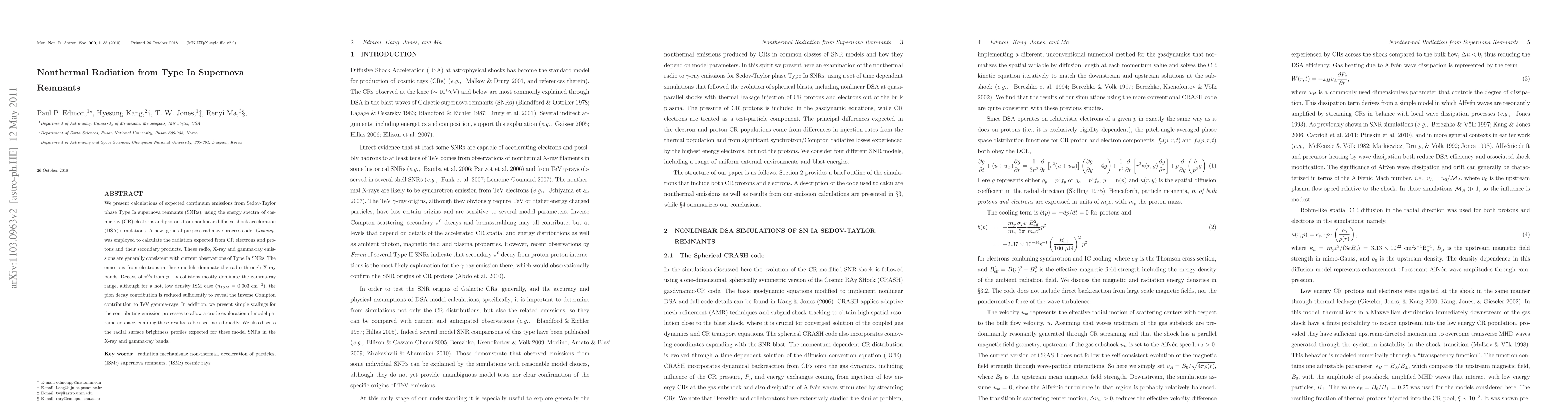 Researchers calculated the expected radiation from Type Ia supernova remnants using simulations of cosmic ray particles and found consistent results with current observations, dominated by electron emissions in radio through X-ray bands.