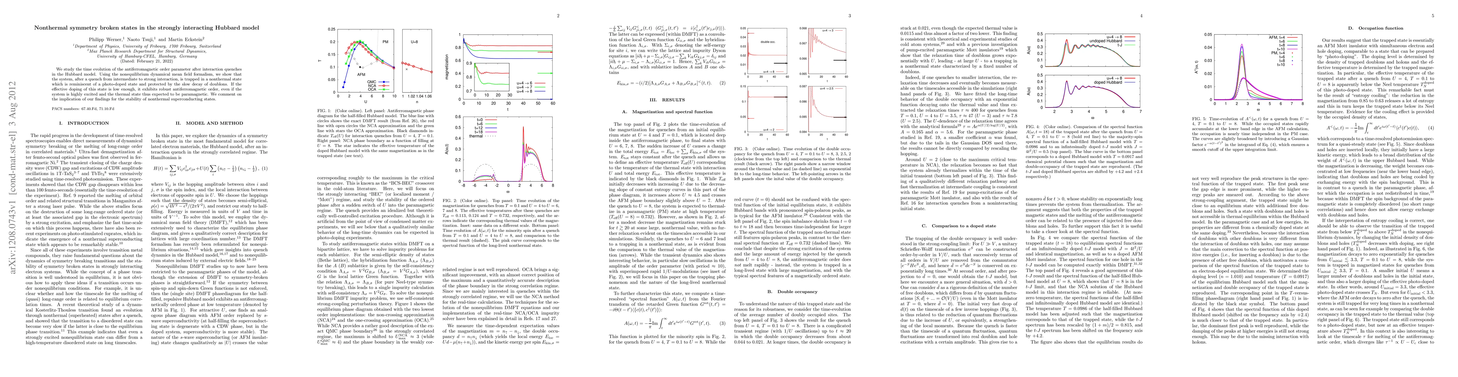 This study reveals that the Hubbard model, after an interaction quench, can enter a nonthermal state with persistent antiferromagnetic order, akin to a photo-doped state, due to the slow decay of doublons, which has implications for the stability of nonthermal superconducting states.