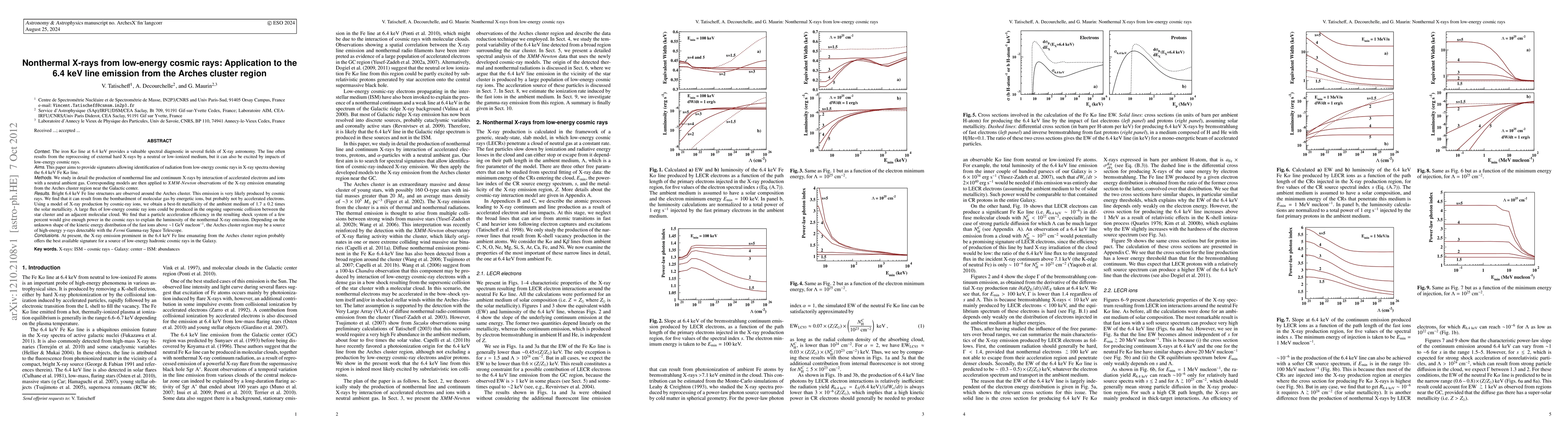 This paper investigates the origin of the 6.4 keV X-ray line in the Arches cluster region, attributing it to nonthermal emissions from low-energy cosmic rays. The study finds that the emission likely originates from energetic ions interacting with molecular gas, suggesting a few percent acceleration efficiency in the shock system formed by the cluster's collision with a nearby molecular cloud.