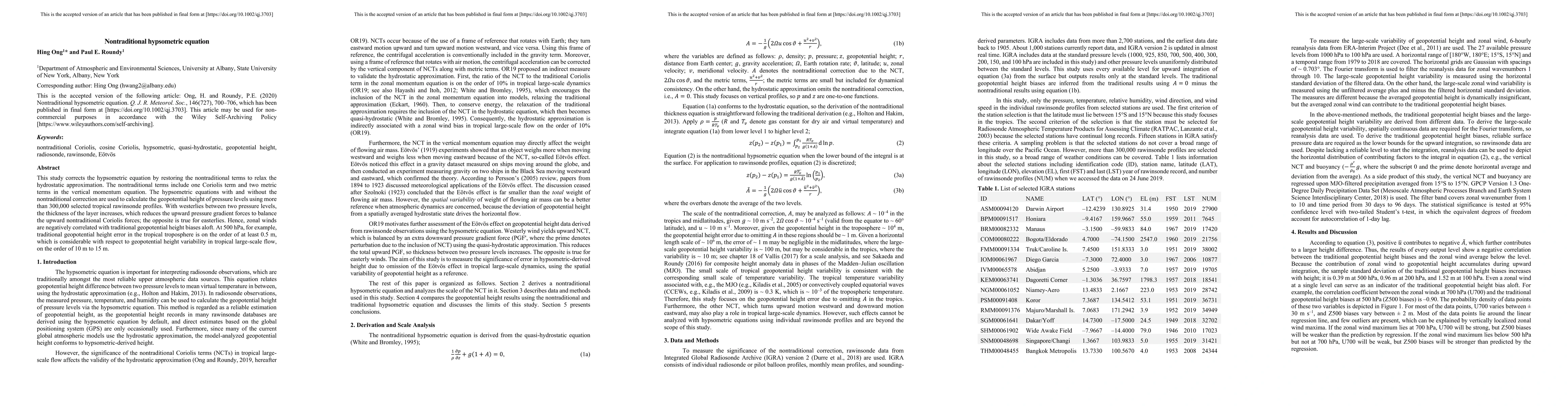 This study corrects the hypsometric equation by incorporating nontraditional terms, including a Coriolis term and two metric terms, to improve accuracy over the hydrostatic approximation. The corrected equation reveals significant geopotential height biases aloft, especially in the tropics, where traditional errors are at least 0.5 m, impacting large-scale flow variability.