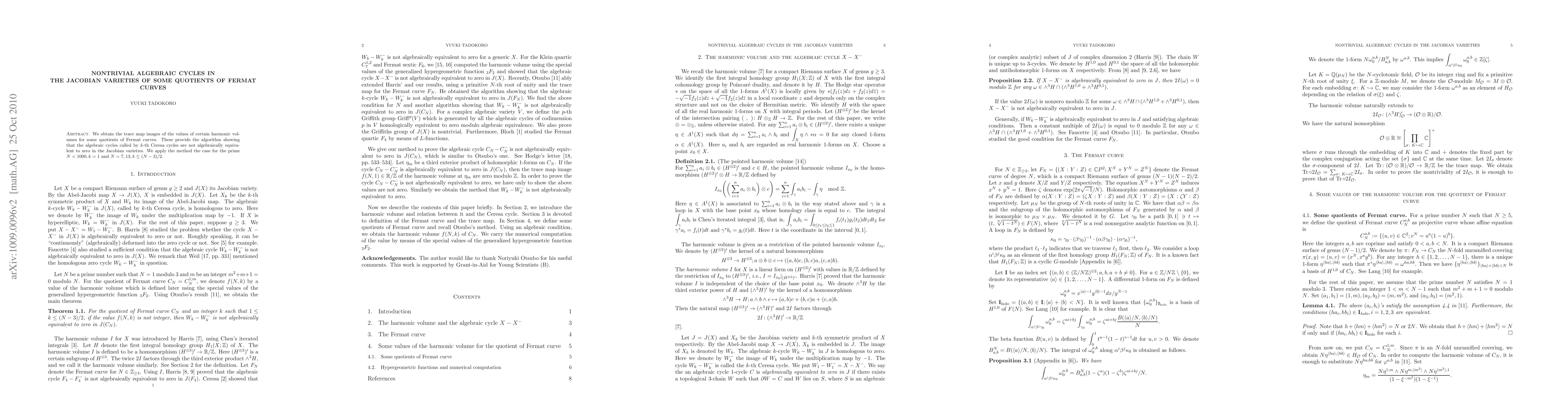 Summary: The paper identifies nontrivial algebraic cycles, specifically k-th Ceresa cycles, in Jacobian varieties of certain Fermat curve quotients, proving they are not algebraically equivalent to zero using harmonic volume trace maps.