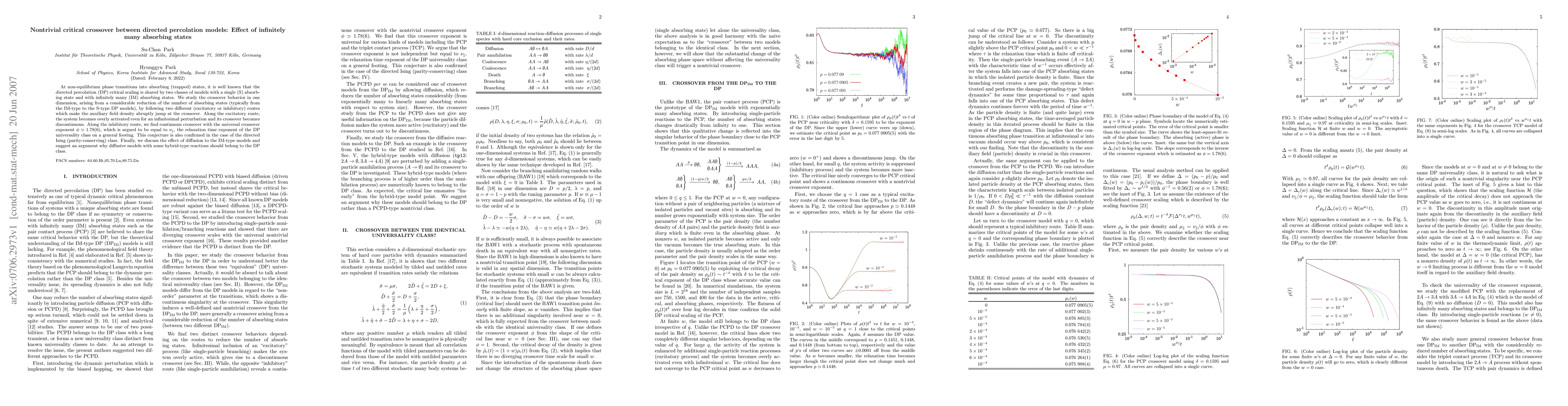 This paper investigates the critical crossover behavior in directed percolation models transitioning from infinitely many absorbing states to a single absorbing state, finding a discontinuous crossover for excitatory routes and a continuous crossover with a universal exponent for inhibitory routes. The study also suggests that diffusive models with hybrid reactions may belong to the directed percolation class.