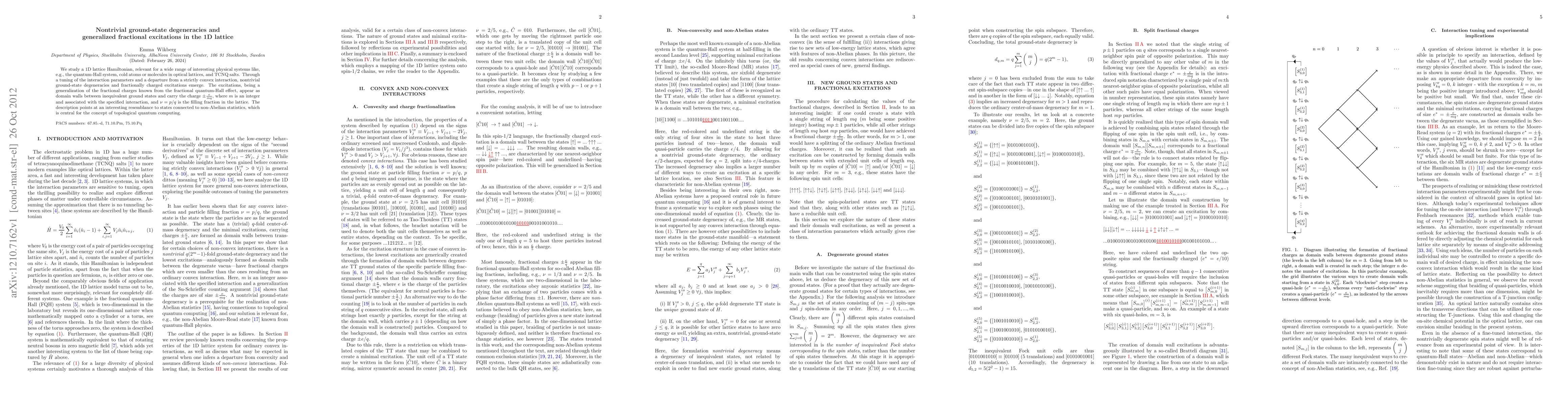 We study a 1D lattice Hamiltonian, relevant for a wide range of interesting physical systems like, e.g., the quantum-Hall system, cold atoms or molecules in optical lattices, and TCNQ salts. Through a tuning of the interaction parameters and a departure from a strictly convex interaction, nontrivial ground-state degeneracies and fractionally charged excitations emerge. The excitations, being a generalization of the fractional charges known from the fractional quantum-Hall effect, appear as domain walls between inequivalent ground states and carry the charge +e/mq or -e/mq, where m is an integer and associated with the specified interaction, and v = p/q is the filling fraction in the lattice. The description points at an interesting resemblance to states connected to non-Abelian statistics, which is central for the concept of topological quantum computing.