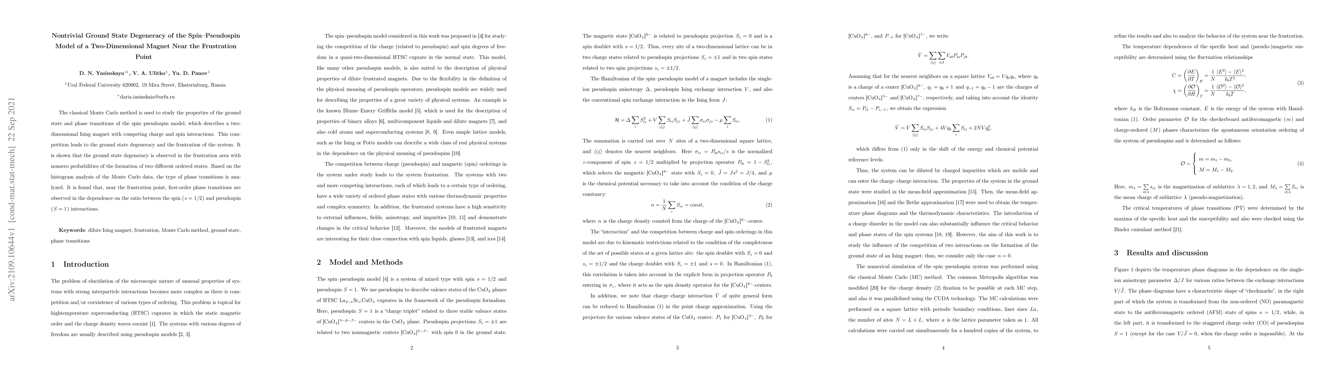The study uses classical Monte Carlo methods to investigate the spin-pseudospin model of a two-dimensional Ising magnet, revealing nontrivial ground state degeneracy and first-order phase transitions near the frustration point due to competing charge and spin interactions. The analysis shows nonzero probabilities of two different ordered states forming in the frustration area.