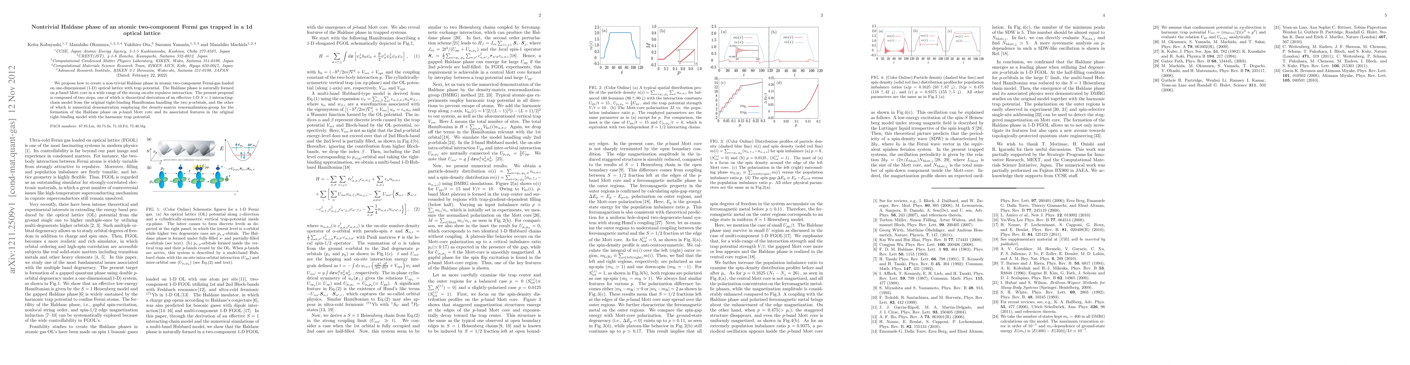 We propose how to create a non-trivial Haldane phase in atomic two-component Fermi-gas loaded on one-dimensional (1-D) optical lattice with trap potential. The Haldane phase is naturally formed on $p$-band Mott core in a wide range of the strong on-site repulsive interaction. The present proposal is composed of two steps, one of which is theoretical derivation of an effective 1-D S=1 interacting-chain model from the original tight-binding Hamiltonian handling the two $p$-orbitals, and the other of which is numerical demonstration employing the density-matrix renormalization-group for the formation of the Haldane phase on $p$-band Mott core and its associated features in the original tight-binding model with the harmonic trap potential.