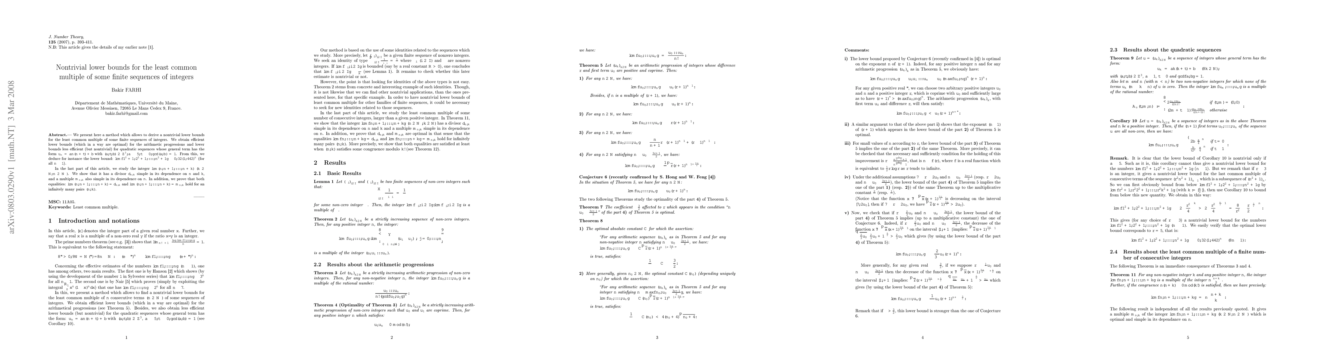 We present here a method which allows to derive a nontrivial lower bounds for the least common multiple of some finite sequences of integers. We obtain efficient lower bounds (which in a way are optimal) for the arithmetic progressions and lower bounds less efficient (but nontrivial) for quadratic sequences whose general term has the form $u_n = a n (n + t) + b$ with $(a, t, b) \in {\mathbb{Z}}^3, a \geq 5, t \geq 0, \rm{gcd}(a, b) = 1$. From this, we deduce for instance the lower bound: $\mathrm{lcm}\{1^2 + 1, 2^2 + 1, ..., n^2 + 1\} \geq 0,32 (1,442)^n$ (for all $n \geq 1$). In the last part of this article, we study the integer $\mathrm{lcm}(n, n + 1, ..., n + k)$ $(k \in \mathbb{N}, n \in {\mathbb{N}}^*)$. We show that it has a divisor $d_{n, k}$ simple in its dependence on $n$ and $k$, and a multiple $m_{n, k}$ also simple in its dependence on $n$. In addition, we prove that both equalities: $\mathrm{lcm}(n, n + 1, ..., n + k) = d_{n, k}$ and $\mathrm{lcm}(n, n + 1, ..., n + k) = m_{n, k}$ hold for an infinitely many pairs $(n, k)$.