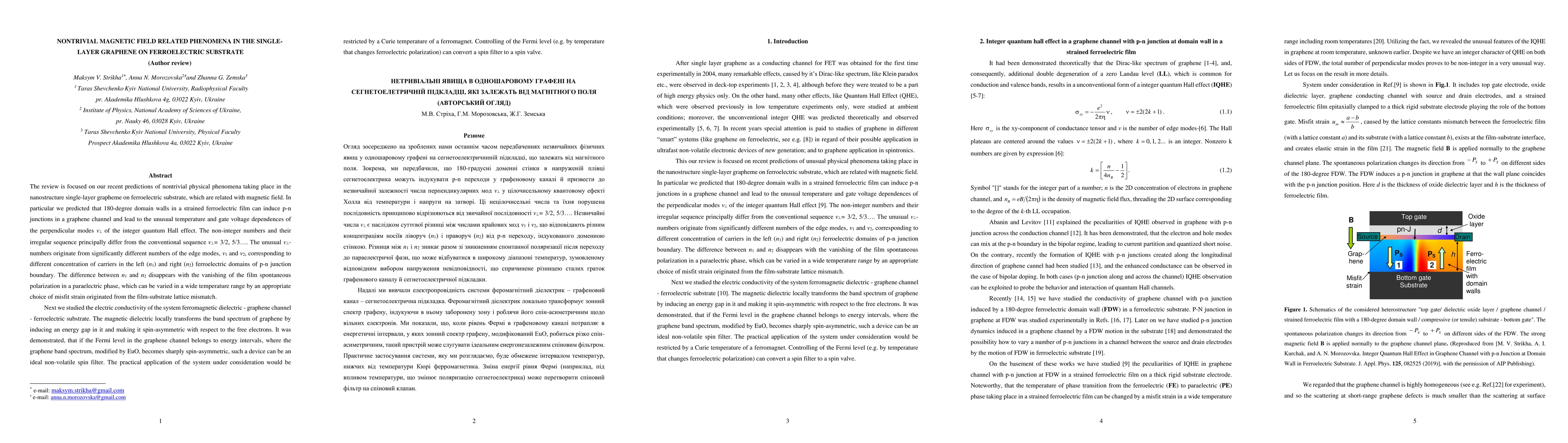 The review is focused on our recent predictions of nontrivial physical phenomena taking place in the nanostructure single-layer grapheme on ferroelectric substrate, which are related with magnetic field. In particular we predicted that 180-degree domain walls in a strained ferroelectric film can induce p-n junctions in a graphene channel and lead to the unusual temperature and gate voltage dependences of the perpendicular modes {\nu} of the integer quantum Hall effect. The non-integer numbers and their irregular sequence principally differ from the conventional sequence {\nu}= 3/2, 5/3. The unusual v-numbers originate from significantly different numbers of the edge modes, {\nu}1 and {\nu}2, corresponding to different concentration of carriers in the left (n1) and right (n2) ferroelectric domains of p-n junction boundary. The difference between n1 and n2 disappears with the vanishing of the film spontaneous polarization in a paraelectric phase, which can be varied in a wide temperature range by an appropriate choice of misfit strain originated from the film-substrate lattice mismatch. Next we studied the electric conductivity of the system ferromagnetic dielectric - graphene channel - ferroelectric substrate. The magnetic dielectric locally transforms the band spectrum of graphene by inducing an energy gap in it and making it spin-asymmetric with respect to the free electrons. It was demonstrated, that if the Fermi level in the graphene channel belongs to energy intervals, where the graphene band spectrum, modified by EuO, becomes sharply spin-asymmetric, such a device can be an ideal non-volatile spin filter. The practical application of the system under consideration would be restricted by a Curie temperature of a ferromagnet. Controlling of the Fermi level (e.g. by temperature that changes ferroelectric polarization) can convert a spin filter to a spin valve.
