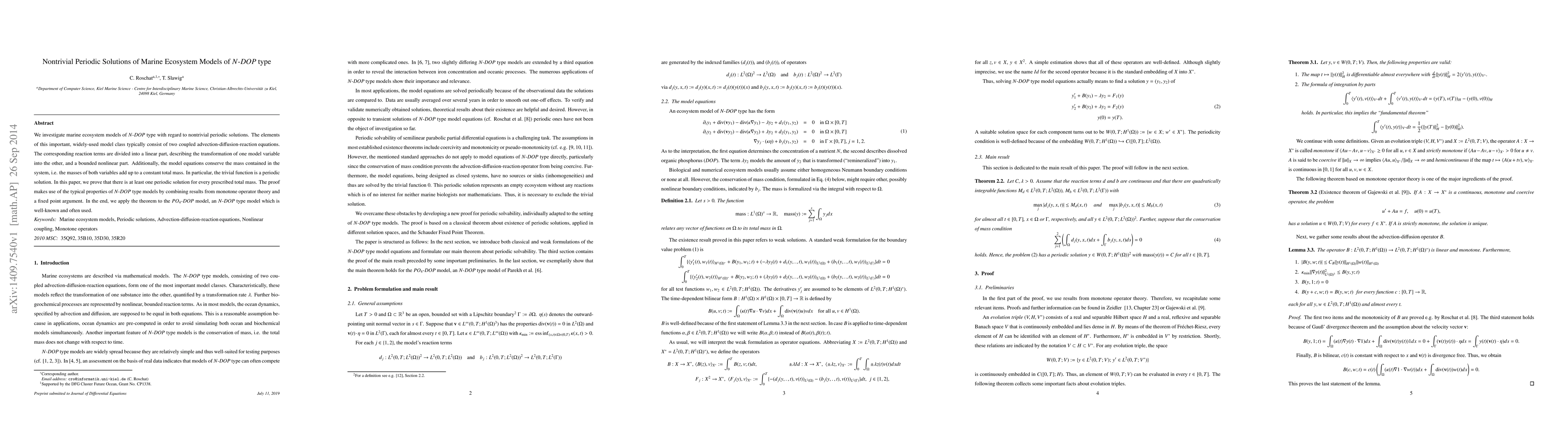 We investigate marine ecosystem models of N-DOP type with regard to nontrivial periodic solutions. The elements of this important, widely-used model class typically consist of two coupled advection-diffusion-reaction equations. The corresponding reaction terms are divided into a linear part, describing the transformation of one model variable into the other, and a bounded nonlinear part. Additionally, the model equations conserve the mass contained in the system, i.e. the masses of both variables add up to a constant total mass. In particular, the trivial function is a periodic solution. In this paper, we prove that there is at least one periodic solution for every prescribed total mass. The proof makes use of the typical properties of N-DOP type models by combining results from monotone operator theory and a fixed point argument. In the end, we apply the theorem to the PO4-DOP model, an N-DOP type model which is well-known and often used.