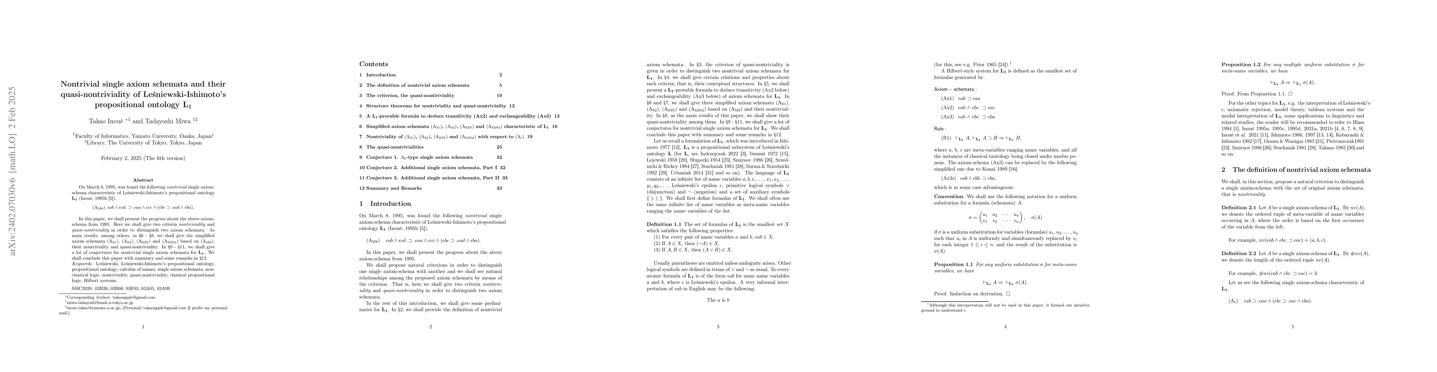 On March 8, 1995, was found the following nontrivial single axiom-schema characteristic of Le\'{s}niewski-Ishimoto's propositional ontology $\bf L_1$ (Inou\'{e} \cite{inoue16}). $$(\mbox{$\mathrm{A_{M8}}$)} \enspace \epsilon ab \wedge \epsilon cd . \supset . \epsilon aa \wedge \epsilon cc \wedge (\epsilon bc \supset . \epsilon ad \wedge \epsilon ba).$$ In this paper, we shall present the progress about the above axiom-schema from 1995 and conjectures about it. Here we shall give two criteria \it nontiriviality \rm and \it quasi-nontriviality \rm in order to distinguish two axiom-schemata.