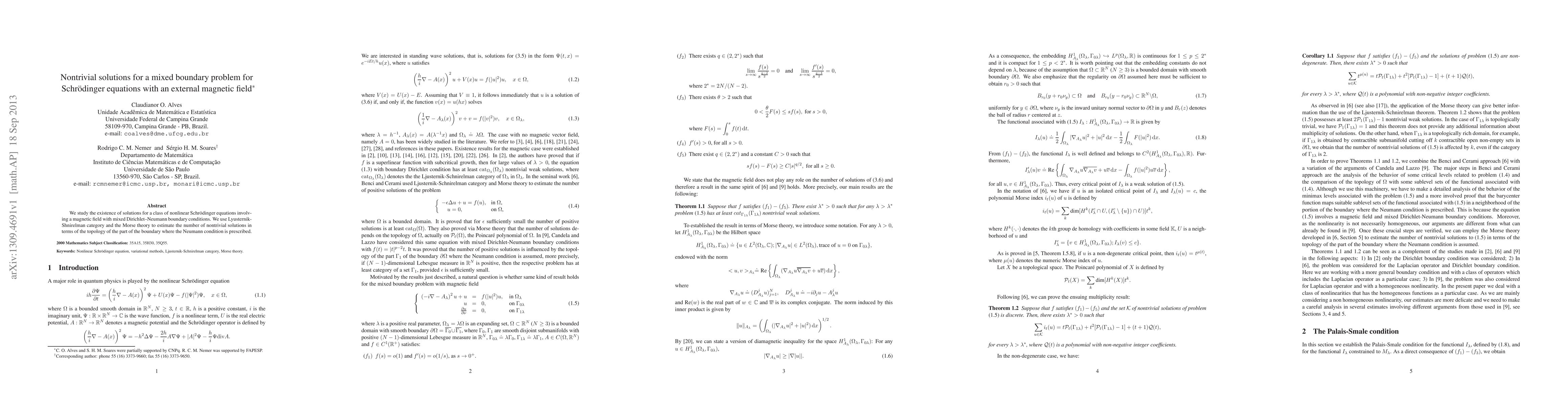 This paper investigates the existence of nontrivial solutions for nonlinear Schrödinger equations with mixed boundary conditions and an external magnetic field, employing Lyusternik-Shnirelman category and Morse theory to determine the number of such solutions based on the topology of the Neumann boundary region.