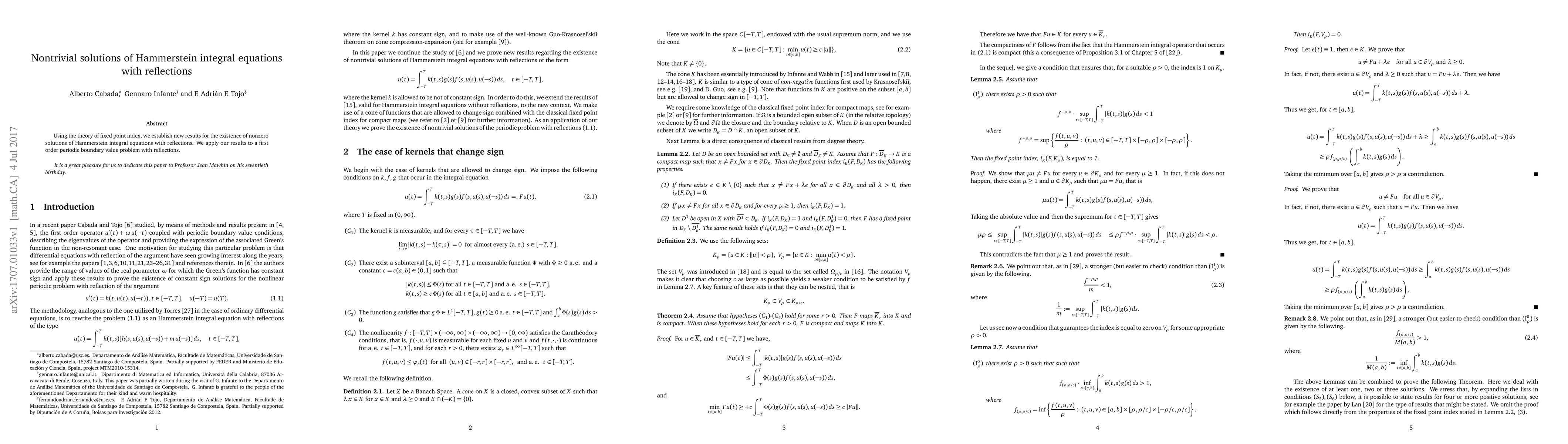 Using the theory of fixed point index, we establish new results for the existence of nonzero solutions of Hammerstein integral equations with reflections. We apply our results to a first order periodic boundary value problem with reflections.