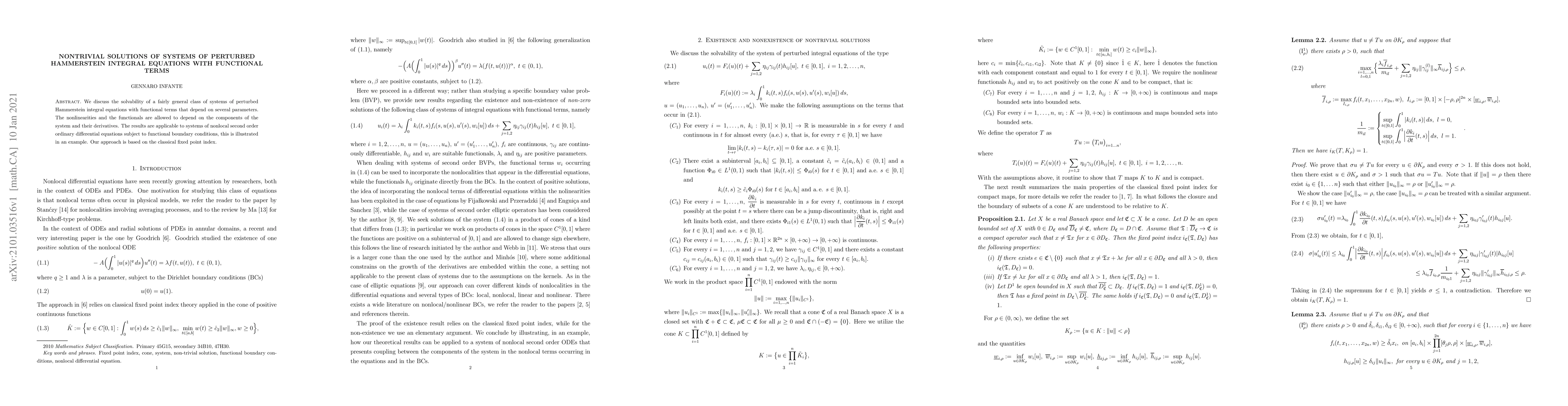 This paper explores the existence of nontrivial solutions for systems of perturbed Hammerstein integral equations with functional terms, employing the classical fixed point index. The methodology is demonstrated through its application to nonlocal second-order ordinary differential equations with functional boundary conditions.